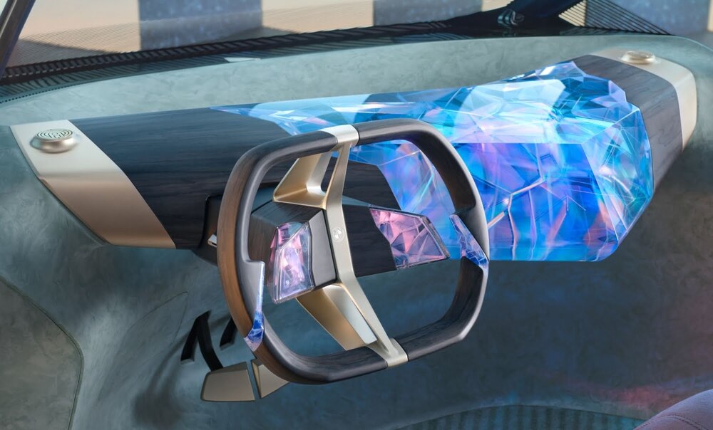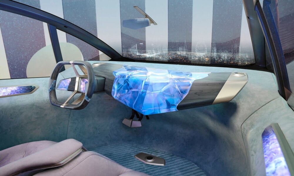 Dışarıda olduğu gibi içeride de geleceğe yönelik vizyon ön plana çıkıyor. İçerdeki malzemelerin büyük bir kısmı 3B baskı ile hazırlanıyor. Koltuk döşemelerinde ve zemindeki halıda geri dönüştürülmüş plastik kullanılıyor. Geleneksel bir gösterge paneli yerine yine 3B baskılı kristal kullanıcı arayüzü bulunuyor. BMW gösterge panelinde olan bilgileri ön cama yansıtarak araç içindeki ekran ihtiyacını da ortadan kaldırıyor.