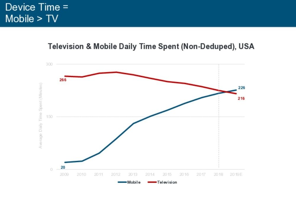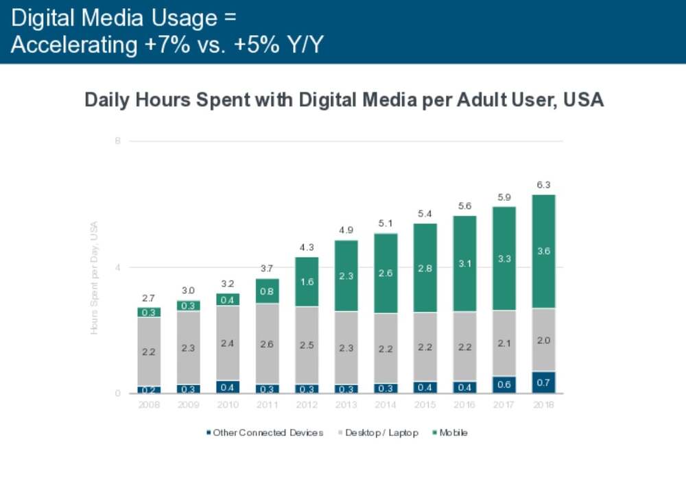 Dijital ortamlarda geçirilen süre artış trendinde devam ediyor. ABD’deki kullanıcılar, geçen seneye göre yüzde 7’lik bir artışla, günde 6,3 saat dijital medya kullanıyor. Bu kullanımın büyük çoğunluğu mobil cihazlar üzerinden sağlanıyor. Mobil cihazların seneler içerisindeki kullanım saati artarken masaüstü kullanımında az da alsa bir düşüş yaşanıyor. Telefon kullanımındaki artış televizyonu da geçmiş durumda. ABD’de 2018’in ikinci yarısında telefonda ve televizyonda geçirilen saat eşitlenirken bu tarihten sonra mobil cihazlar üzerinde geçirilen zamanlar televizyonu geçti. Fark açılmaya devam ediyor.