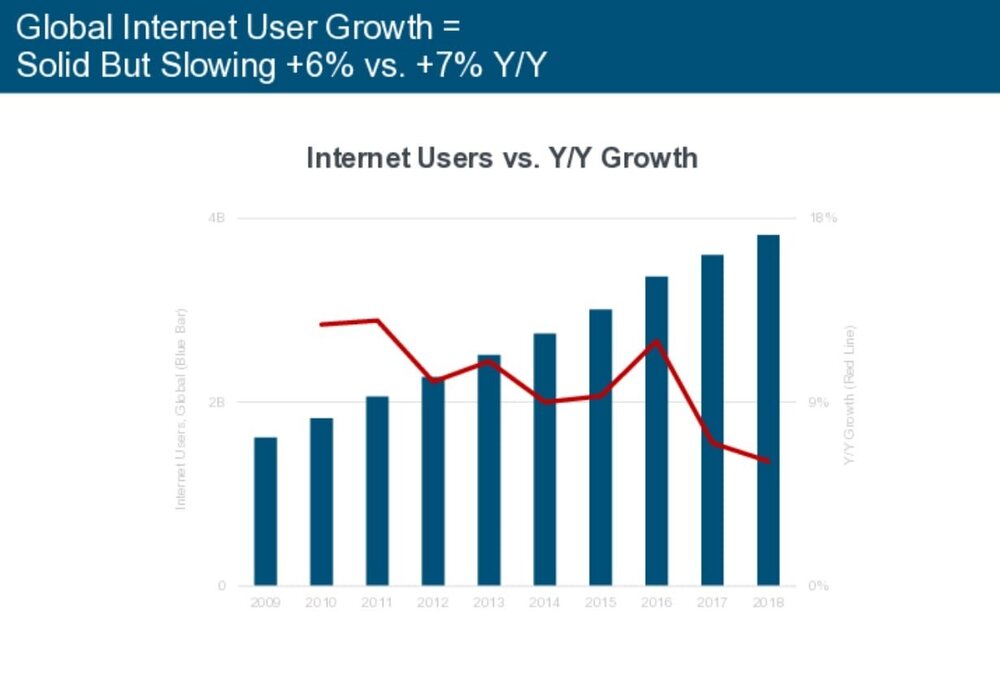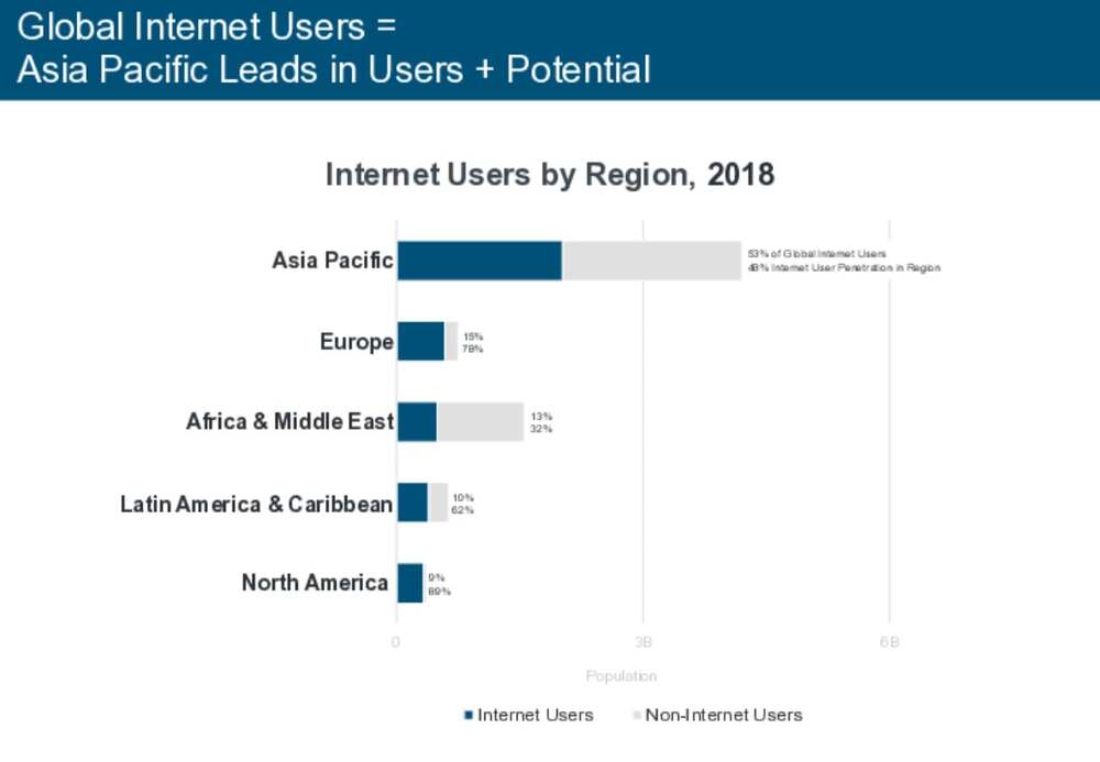 Küresel internet kullanımdaki artış hızı önceki yıllara göre yavaşlasa da genel anlamda artmaya devam ediyor. 2017 yılında dünyadaki 3,6 milyar insan internet kullanıyorken 2018 yılında bu sayış 3,8 milyara ulaştı. Yani dünyanın yüzde 51’i internet kullanıyor. Bu kullanımın içinde nüfusun en fazla olduğu Asya Kıtası 2 milyarın üzerindeki insanla birinci sırada bulunuyor. Toplam kullanıcıların yüzde 21’i Çin’de bulunurken bu ülkeyi Hindistan ve ABD takip ediyor.