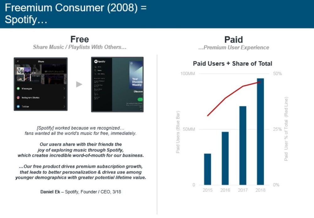 Freemium modelin kullanılması daha çok kullanıcıya ulaşmayı sağlarken sosyal paylaşımı ve ağı arttırıyor. Özellikle oyunlardaki ve girişimlerdeki ücretsiz kullanım seçenekleri kullanıcıların seçim faktörünü etkiliyor. Örneğin ücretsiz olarak kullanılabilen Spotify’ın premium (seçkin) seçeneği de bulunuyor. Kullanıcıların yarısına yakını kişisel deneyimini iyileştirmek için ücretsiz olarak sahip olduğu uygulamada bir üst seviyeyi tercih edebiliyor. Bu trend artış eğiliminde ilerlemeye devam ediyor.