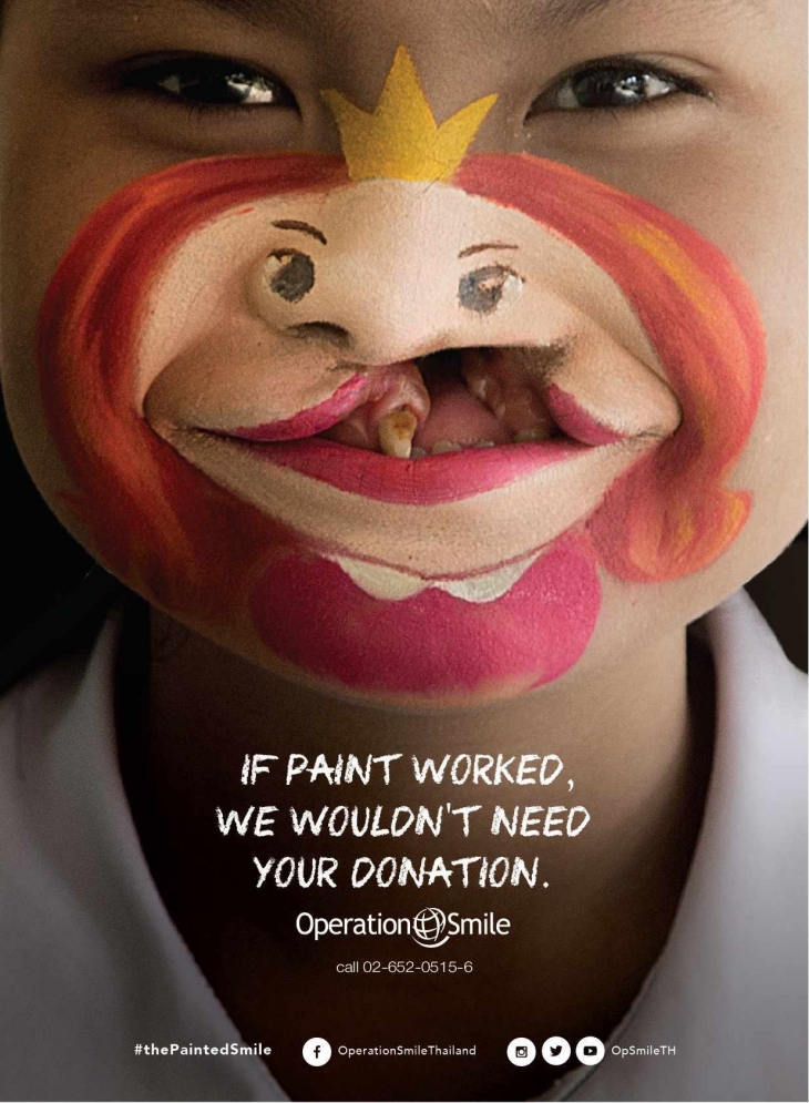 İhtiyacı olan çocukların yarık dudak ameliyatı olabilmeleri çalışan Operation Smile vakfı, “The Painted Smile” (Boyalı Gülüşler) kampanyası ile bu çocukların yaşadığı sıkıntılara dikkati çekip, insanları daha fazla bağış yapmaya davet ediyor.