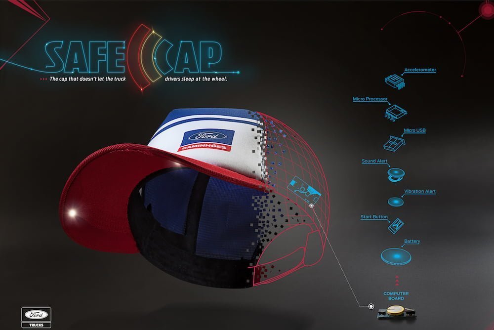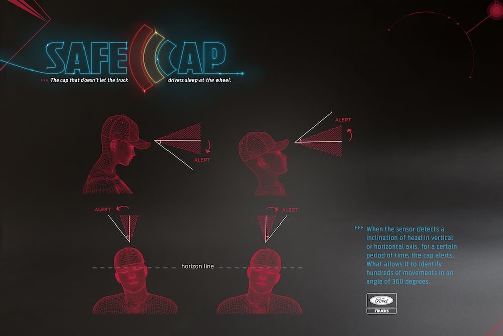 Reklam ajansı GTB Sao Paulo ve Ford iş birliğiyle geliştirilen SafeCap, sıradan bir kep görünümünde. Ancak aslında hiç de sıradan değil zira kep güvenliğe yönelik teknolojilerle donatılmış. Sürücünün uyuyakalmasının önüne geçmek için tasarlanan giyilebilir teknoloji ürünü SafeCap, sürücünün hareketlerini okuyor. Kepin içerisine yerleştirilmiş sensörler; otomobil kullanmakla ilgili hareketleri uyuma ve gevşeme ile ilgili olanlardan ayırıyor ve özel bir yazılım aracılığıyla boyun kaslarının gevşediği anları belirliyor. Uyku veya uykuya geçiş algıladığında ise titreşim, ışık ve ses yollu 3 uyarı ile sürücüyü uyandırıyor.