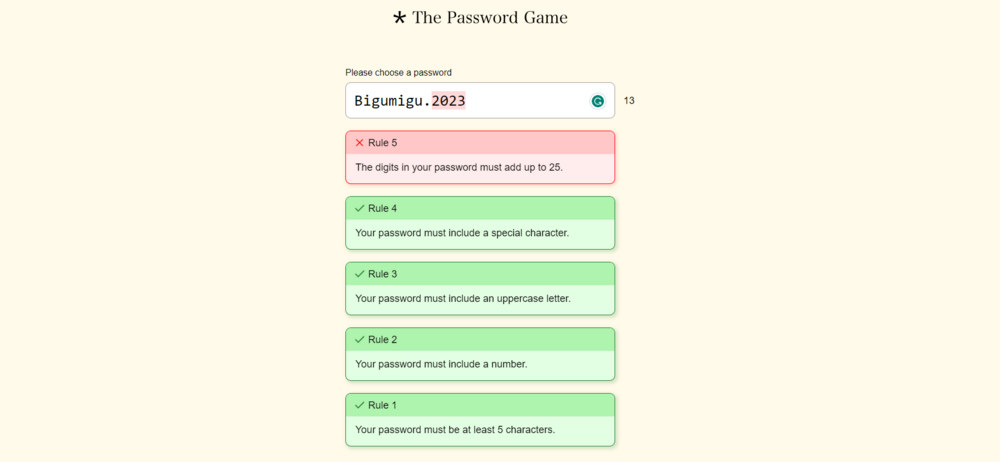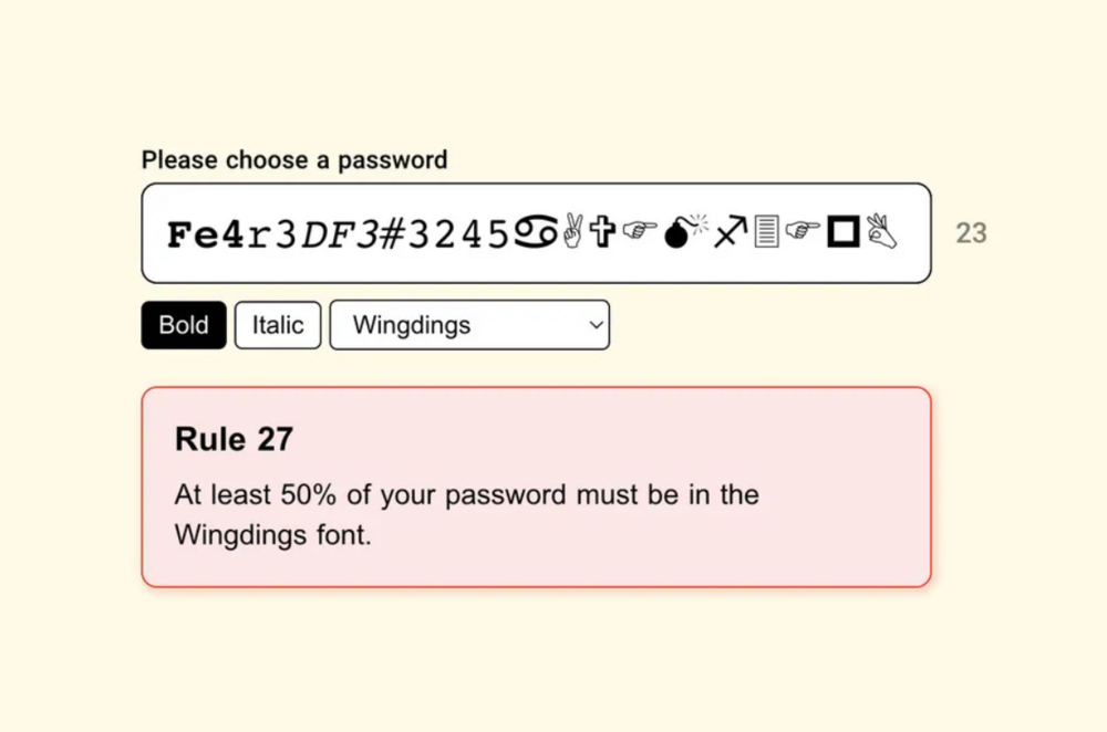 Agarwal tarafından geliştirilen ve 27 Haziran’da yayına alınan ücretsiz web tabanlı bir oyun olan The Password Game (Şifre Oyunu), aşılması zorlu kurallarıyla kısa sürede viral oldu. Basit bir ara yüze sahip oyunun web sayfasında sizi önce “Lütfen bir şifre seçiniz” ifadesi karşılıyor. Belirlediğiniz şifreyi boş alana girdikten sonra oyunun katmanları açılmaya başlıyor. Diyelim ki, yılların kullanıcısı olarak biri mutlaka büyük harf olmak üzere küçük harf, rakam ve noktalama işareti bulunan olası şifrenizi tüm özgüveninizle girdiniz. İşte bu noktada oyun size şifre oluşturmaya dair bildiklerinizi unutturacak yeni kurallar dayatmaya başlıyor.