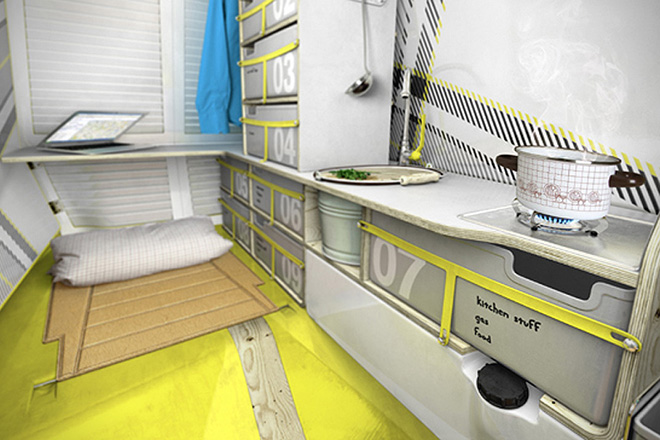 Katlanabilen bir yatak, ufacık bir mutfak, lavabo, küçük çekmeceler, su deposu, mini buzdolabı şekilde bu 3 tekerlekli kamp scooterının içine güvenli ve özenli bir şekilde yerleştirilmiş.