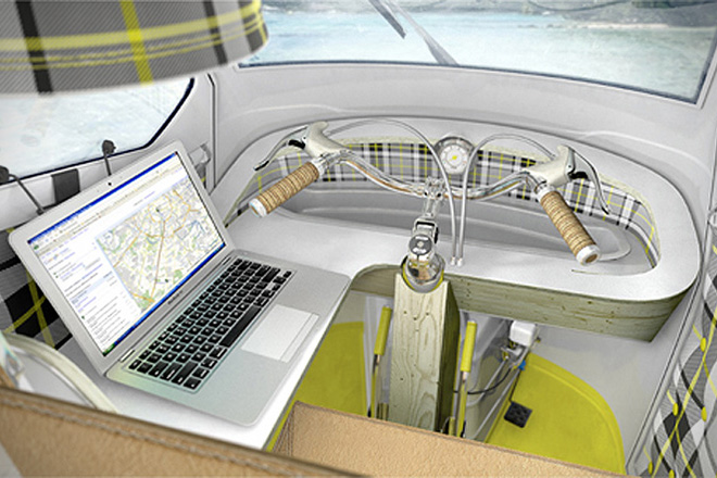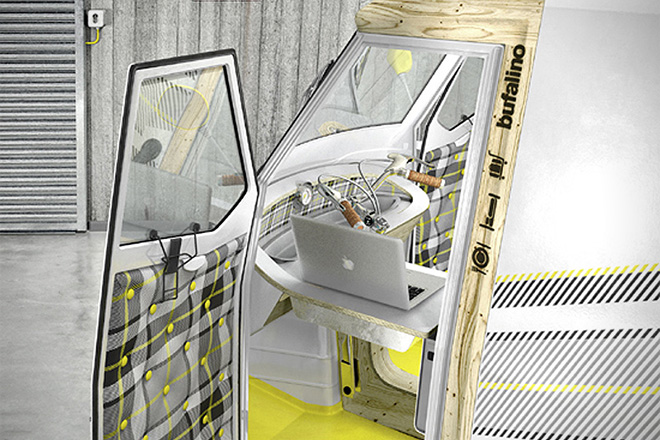 Ayrıca, scooterın içinde laptopla rahatlıkla çalışmayı sağlayacak bir masa, mini mutfağa tek hareketle dönebilmeyi sağlayan bir koltuk bulunuyor. İç mekanda ve kapılardaki çizgilerde sarı ve siyah kullanımı ağır basıyor. Uygun fiyatı ve yakıt tasarrufu sağlayan özellikleriyle tanınan klasik İtalyan tasarımı Piaggio Ape kapalı motosiklet, Comanns’ın tasarımıyla yepyeni bir anlam kazanmış ve kamp yapma keyfini konforla birleştirmiş.