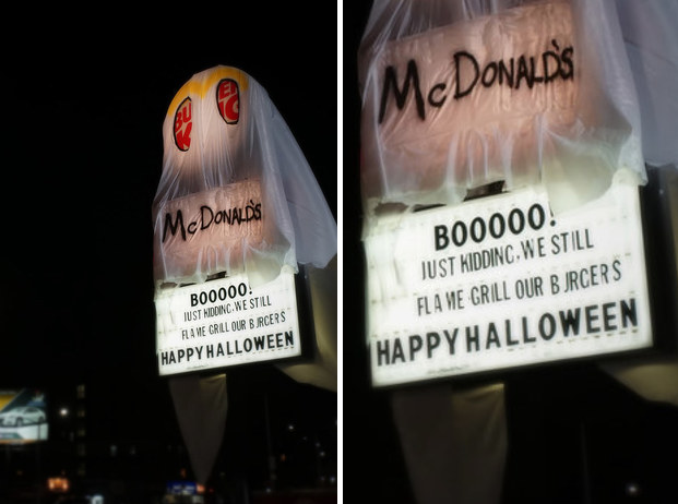Burger King Queens yalnızca McDonald’s hayaletine dönüşmekle kalmadı, dekora bir de mesaj ekledi: “Böööööö. Sadece şaka yapıyoruz. Hala burgerlerimizi ızgara alevinde pişiriyoruz. Cadılar Bayramı kutlu olsun.”.