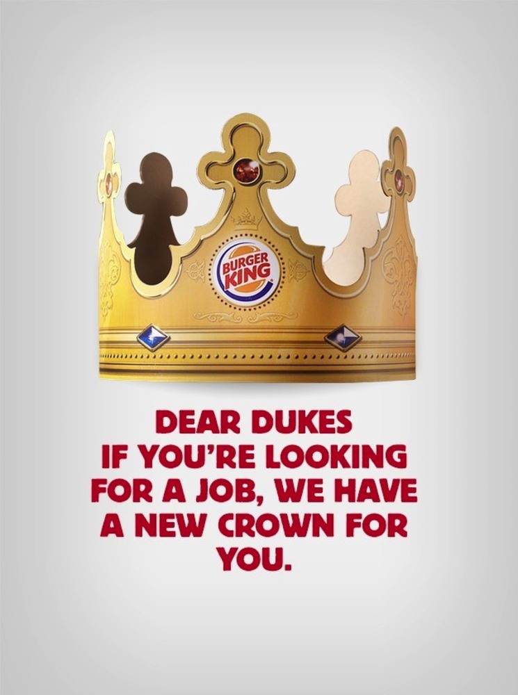 HOY tarafından gerçekleştirilen “Dear Dukes” başlıklı kampanya için Burger King Arjantin’in Instagram ve Facebook hesaplarından yapılan paylaşımda “Sevgili Dükler eğer bir iş arıyorsanız, sizin için yeni bir tacımız var.” ifadeleri yer aldı. Bununla birlikte Instagram gönderisinde “Sevgili Dük, diğer binlerce insan gibi istediğiniz geleceğe sahip olabilirsiniz. Bio’da bulunan linke tıklayın ve ekibimize katılın.” notu düşüldü.