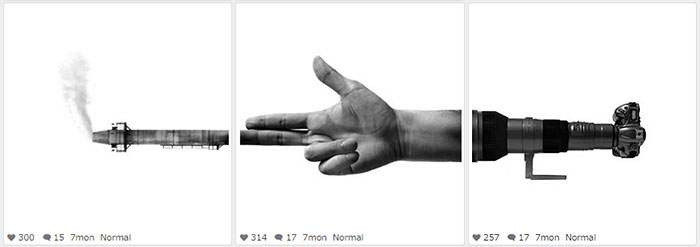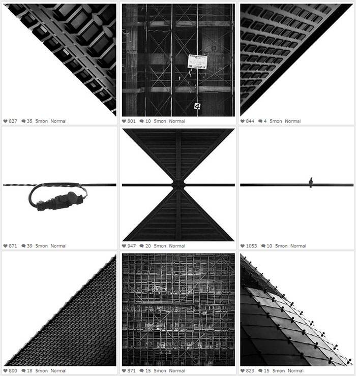 Weijiang, çektiği fotoğraflarla Instagram hesabı üzerinde dijital kolajlar hazırlıyor ancak bunları imajları görsel manipülasyonla birleştirerek ya da fiziksel olarak kesip, bir araya getirerek yapmıyor: Weijiang, kolajları için tüm fotoğrafları küçük kareler halinde bir arada gösteren Instagram grid’ini kullanıyor. Tek tek bakıldığında birbiriyle ilgisiz görünen fotoğrafları uygun sırayla dizince kolaj anlam kazanıyor.