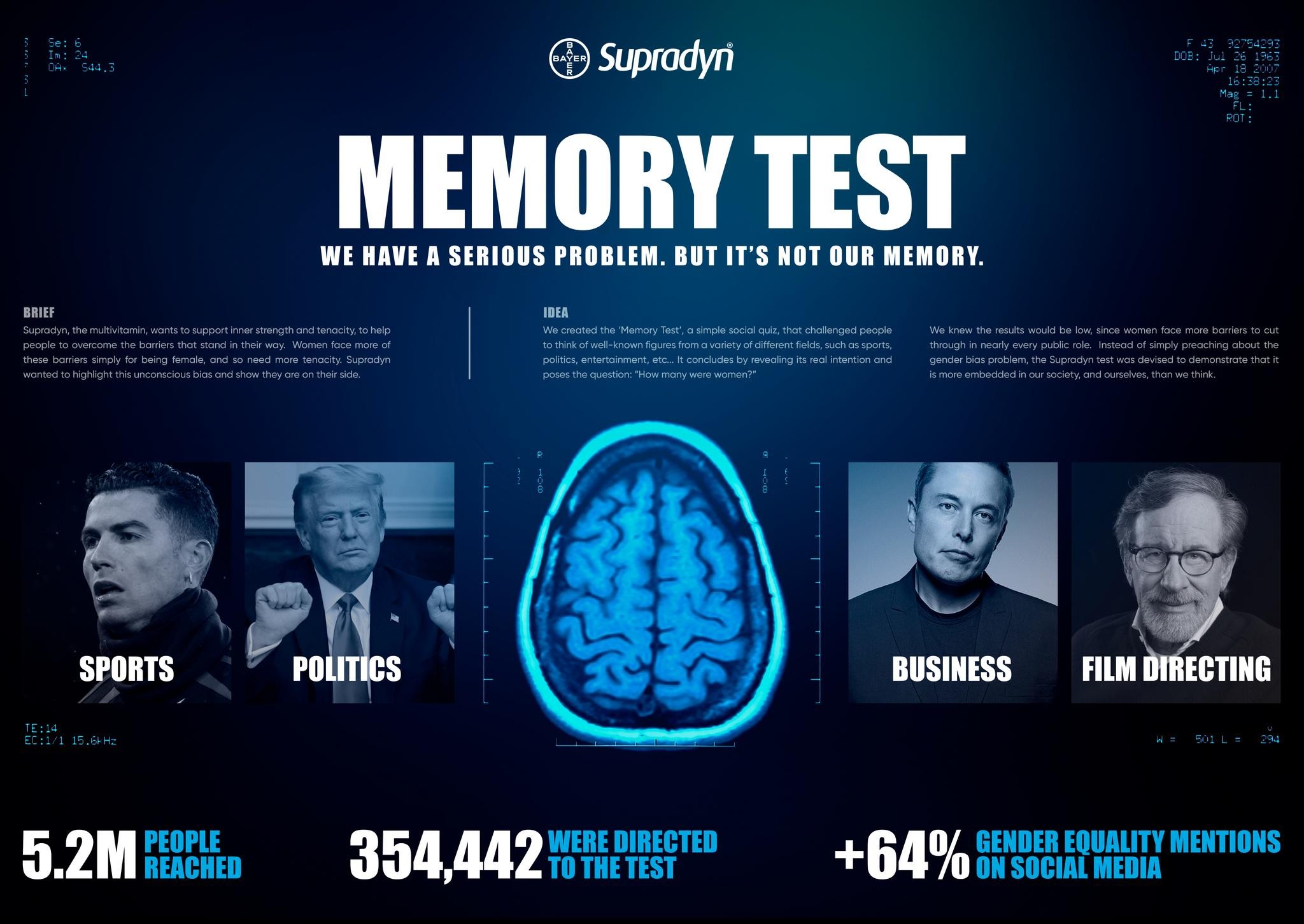 Supradyn Hafıza Testi’nde özetle testi uygulayanlara, spordan siyasete, bilimden eğlenceye kadar farklı alanlarda tanınmış isimler soruluyor ve akıllarına gelen ilk seçeneği düşünmeleri isteniyor. Sonuç olarak testi uygulayanlar hafızalarının ne kadar güçlü olduğunu öğrenmeyi beklese de test sonucu aslında ön yargıların kararlarımızda ne derece etkili olduğunu ortaya koyuyor. Çünkü testi uygulayan her 10 kişiden 4’ünün yanıtlarında kadınlar hiç yer almıyor.