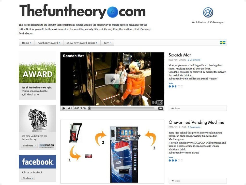 The Fun Theory, Volkswagen’in Blue Motion teknolojilerinin aynı büyük otomobil performansının azaltılmış çevresel etki ile birlikte sunulmasıyla ilgiliydi. Ajans eğlencelerin insan davranışını daha iyi nasıl değiştirebileceğine dair bir çıkış noktasıyla kampanyayı ördü. Kampanyada 700’den fazla teori oluşturuldu ve 20 milyondan fazla YouTube görüntülemesiyle birlikte büyük viral etki yarattı.