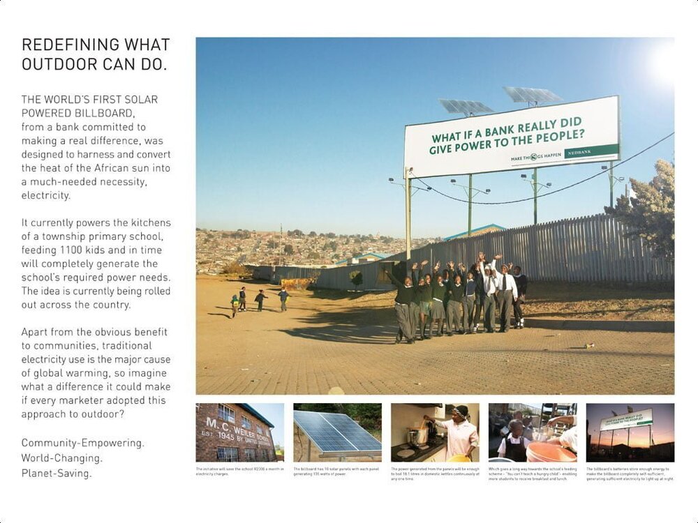 Güney Afrika’nın en fakir muhitlerinden birinde Nedbank ve ajans tasarladıkları açık hava panosundaki ilanla güneş enerjisi depolayıp okullara enerji dağıttı.