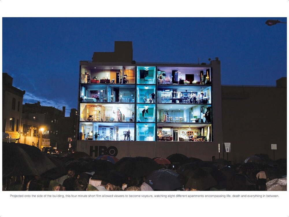 HBO “Voyeur” projesinde HBO’nun reklam ve pazarlama geçmişini görselleştirdi. Kullanıcılar, sekiz kurgusal New York dairesinde meydana gelen olayları görmeye davet edildi. Kampanyanın öne çıkan özelliği, 28 Haziran – 1 Temmuz arasında ve yine 5 – 8 Temmuz 2007 tarihleri arasında New York’ta Broome ve Ludlow sokakları üzerindeki bir binanın yan tarafındaki filmin beş dakikalık bir gösteriminin yapılması oldu. Filmin sitesi olan hbovoyeur.com da “Kimsenin izlemediğini düşündüklerinde insanların ne yaptıklarını görün” sloganıyla hazırlandı.