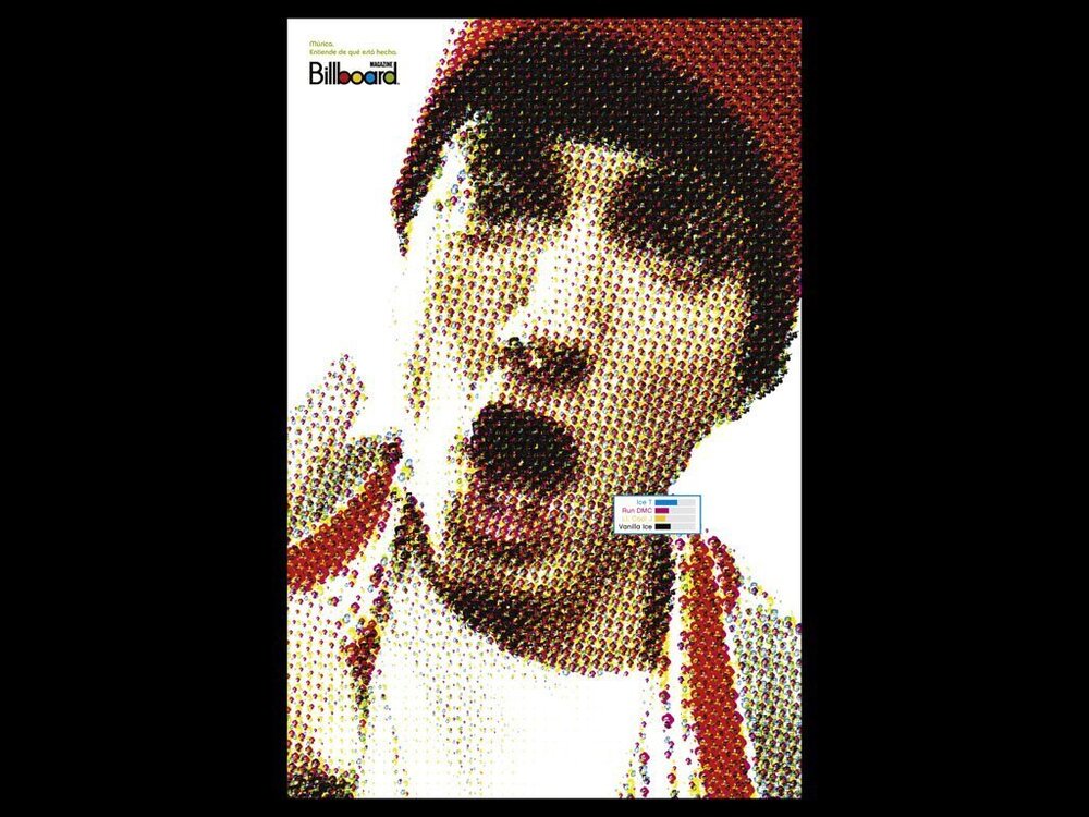 2010 yılında Billboard Brazil’in ilanları hem Grand Prix hem de Gold Lion kazandı. Piksel portrelere yakından bakınca müzisyenleri oluşturan piksellerinde onları oluşturan şeyleri görebiliyorsunuz. Mesela Marilyn Manson’ın ilanında Kiss bir renk kodu olarak kullanılmış.
