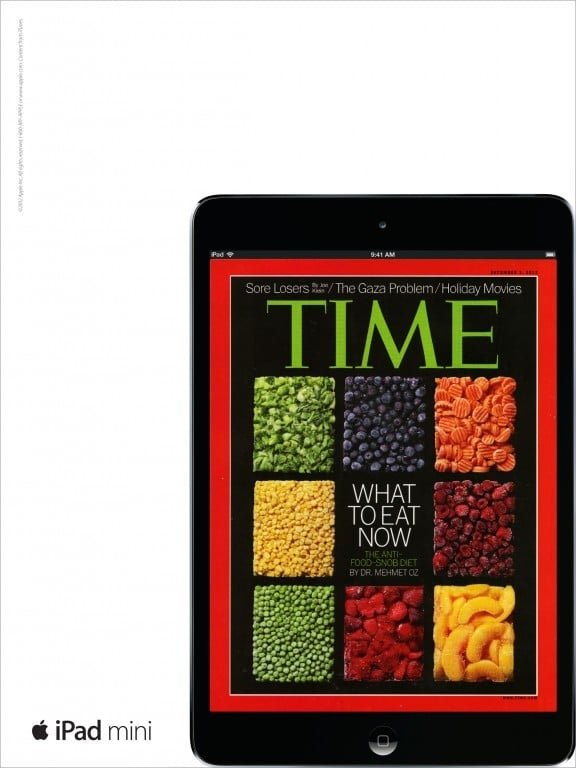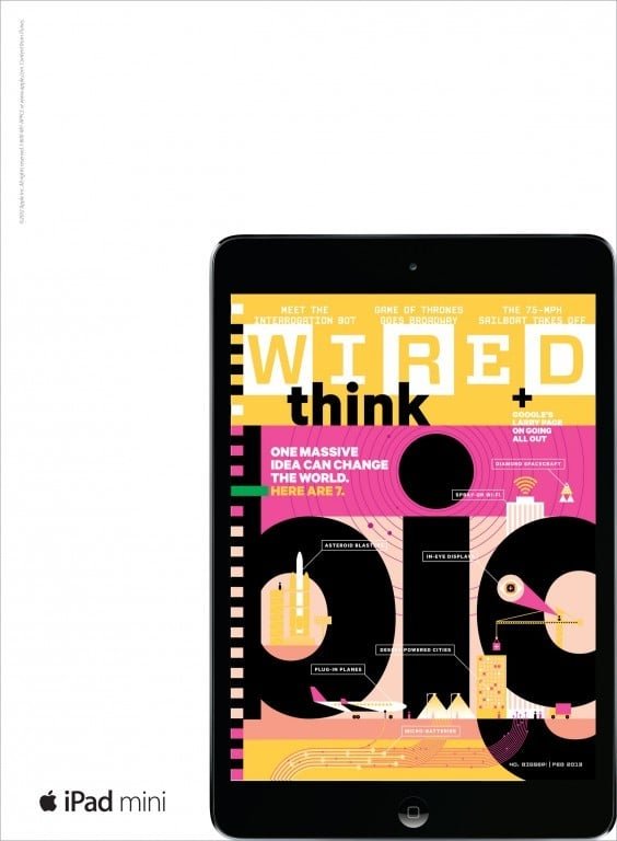 TBWA\Media Arts Lab‘in Apple için hazırladığı tablet reklamları 2013’te Grand Prix kazandı. Reklamlar magazin basınının güzelliğini tablet gibi bir mecrada da öne çıkarıyor. Time, Wired ve The New Yorker gibi çeşitli ulusal dergilerin arka kapaklarında ustaca iPad mini reklamları yerleştirildi. Tableti, derginin bu sayısının gerçek ön kapağını içeren ekranı ile gerçek boyutta gösterdiler.