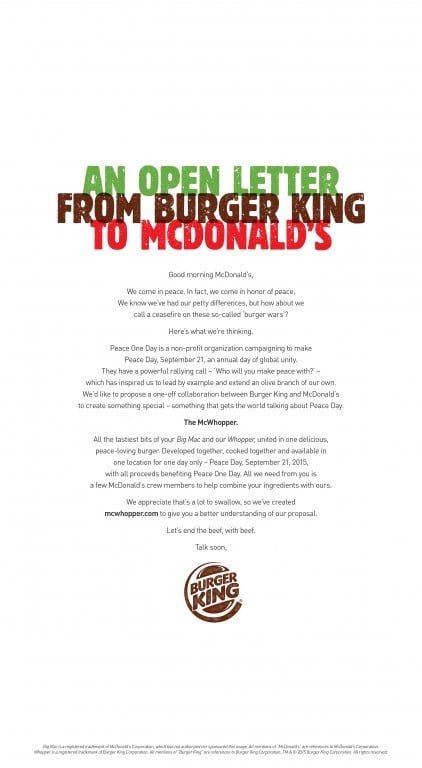 Yine 2016’da ses getiren bir işin ilanı Grand Prix kazandı. Burger King bir günlüğüne McDonald’s’a beyaz bayrak sallamış ve “gel beraber bir hamburger yapalım” demişti. Açık çağrıda bulundukları mektup şeklindeki ilan Grand Prix kazandı.