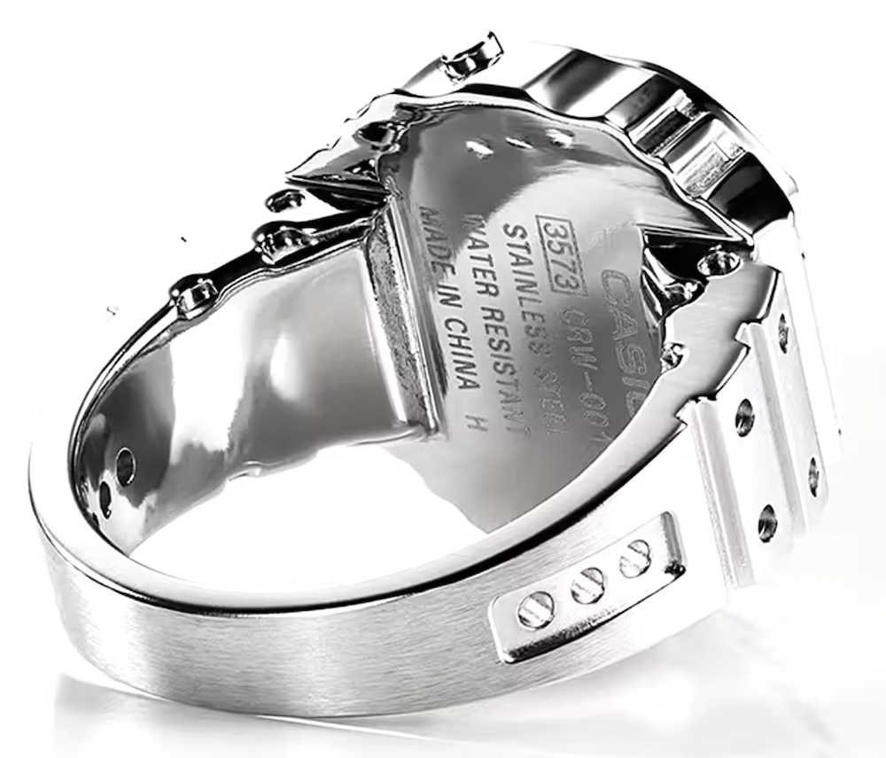 CRW-001-1JR, Casio’nun G-SHOCK ve ICONIC serisindeki dijital modellerin tamamen metal olan minyatür versiyonu gibi görünüyor. Saatin yapımında gelişmiş MIM (Metal Injection Molding / Metal Enjeksiyon Kalıplama) teknolojisi kullanılmış. Toz metal enjeksiyonuna dayalı bu teknolojiyle Casio saatlerinin karmaşık şeklini tamamen yüzük boyutuna indirgeyebilmişler. Kasa, arka kapak ve parmağı saran kayış kısmı; hava geçirmez bir yapı sağlamak için cam yapıştırma teknolojisi kullanılarak tek parça halinde kalıplanmış.