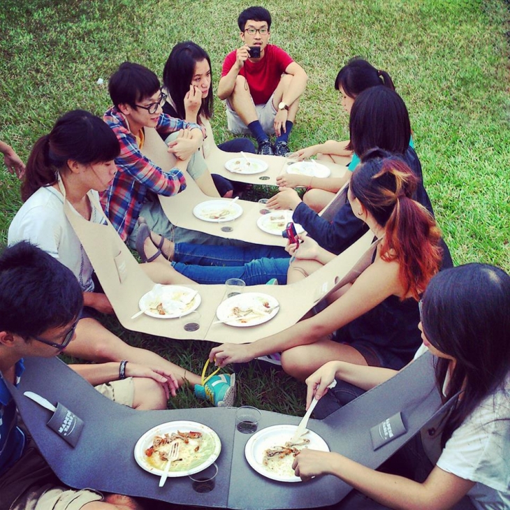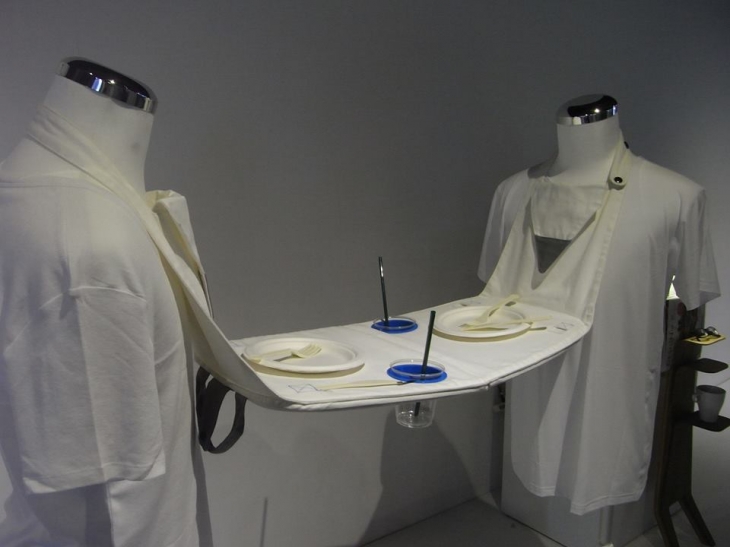 Teknoloji, internet ve cep telefonu bağımlılığımızın ciddi boyutlara geldiği şu yıllarda bu bağımlılığımızdan kurtulmamız için ilginç yöntemler ortaya çıkıyor. Bunlardan biri de Napkin Table. Tunghai Üniversitesi’nden Michael Jan’ın tasarladığı bu büyük peçete, giyilebilir portatif bir piknik masası aslında. Kayışları iki kişi boynuna geçiyor ve masayı dengede tutarak birbirleriyle ilgileniyorlar. Bu da yemek yediğiniz kişiye odaklanmanızı sağlıyor. Normal yemek masalarında cep telefonumuzla ilgilenmemizi sağlayan alan bu portatif piknik masasında bulunmuyor.