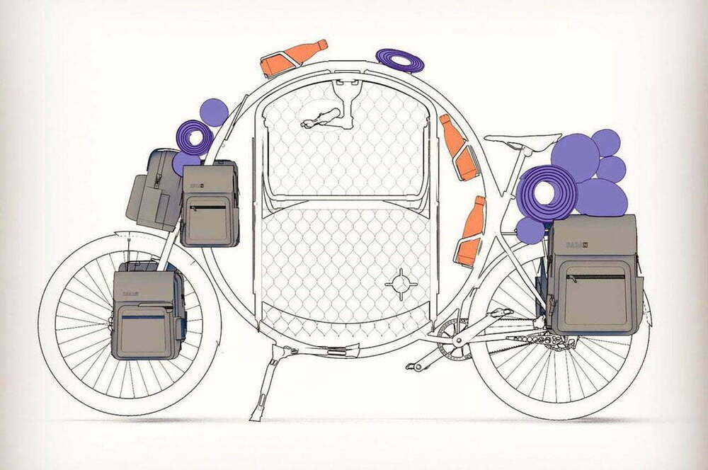 Cercle’ın kadrosu oturmak, yemek yapmak, çalışmak, dinlenmek ve hatta uyumak dahil her türlü ihtiyaç için kullanılabiliyor. Hiç karbon ayak izi bırakmayan çılgın 21. yüzyıl göçebelerinin kalbini çalacak türden bir tasarım. Dikkatle bakarsanız koltuğun yanı sıra sehpalarının da olduğunu görebilirsiniz. Ayrıca geriye yatırdığınızda koltuk kolayca yatağa dönüşebiliyor. Kadronun kendisi ise yüksekte kaldığından çadır iskeleti işlevi görebiliyor. Yani bir sineklikle ya da tente ile yatağınızın üzerini kolaylıkla kapatabiliyorsunuz. Böylece böcek ısırıklarından ya da hava koşullarından korunabiliyorsunuz. Bisikletin önünde ve arkasında eşyaları koyacak bolca bagaj alanı bulunuyor.