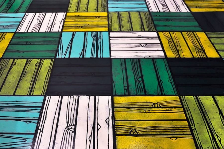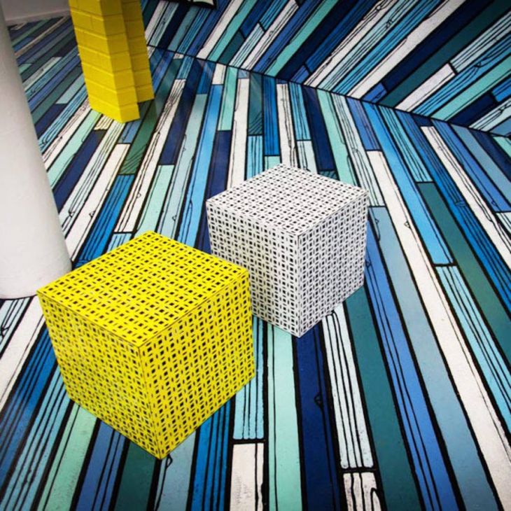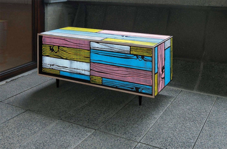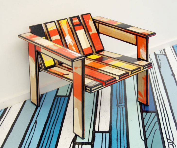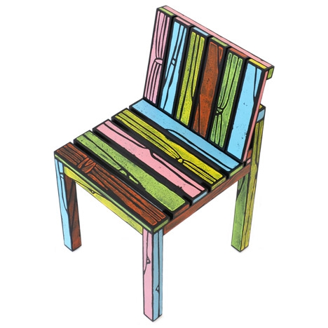 İngiliz sanatçı Richard Woods’un imzasını taşıyan rengarenk mobilyalar, 2 boyutlu çizgi film çizimlerini andırıyor. Woods’un imza desen olarak kullandığı tahta desenleri için, yine tahta olan sandalyelerin üzerine baskı yöntemiyle plastik renkler basılıyor ve illüstrasyon havasının oluşması için sandalyenin kenarlarına kontur atıyor.