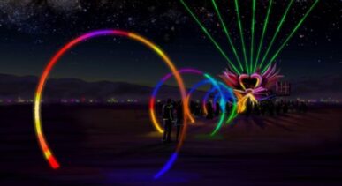 Dancing in the Sky, geçtiğimiz yıl yer verdiğimiz “Imagining Future Coachellas” projesini anımsattı bana. Mimari tasarımcı Roger Wilson bu projede, yapay zeka kullanarak gelecekte bu festivali nasıl hayal ettiğini görselleştirmişti. Bu yapay zeka ürünü görüntülerde, Dancing in the Sky gibi rengarenk eserler yer alıyordu.