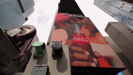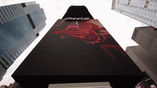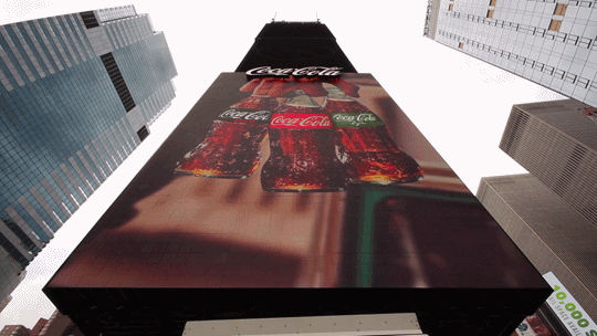 Rekor kırmayı ve pek çok konuda ilklere imza atmayı seven Coca-Cola; yeni Times Square panosuyla dünyanın ilk 3 boyutlu robotik LED panosunu da sahiplenmiş oldu. Pano; 1715 hareketli ve 245 statik LED küpten oluşuyor. Bu da 240 metrekarelik bir görsel alan oluşturuyor.