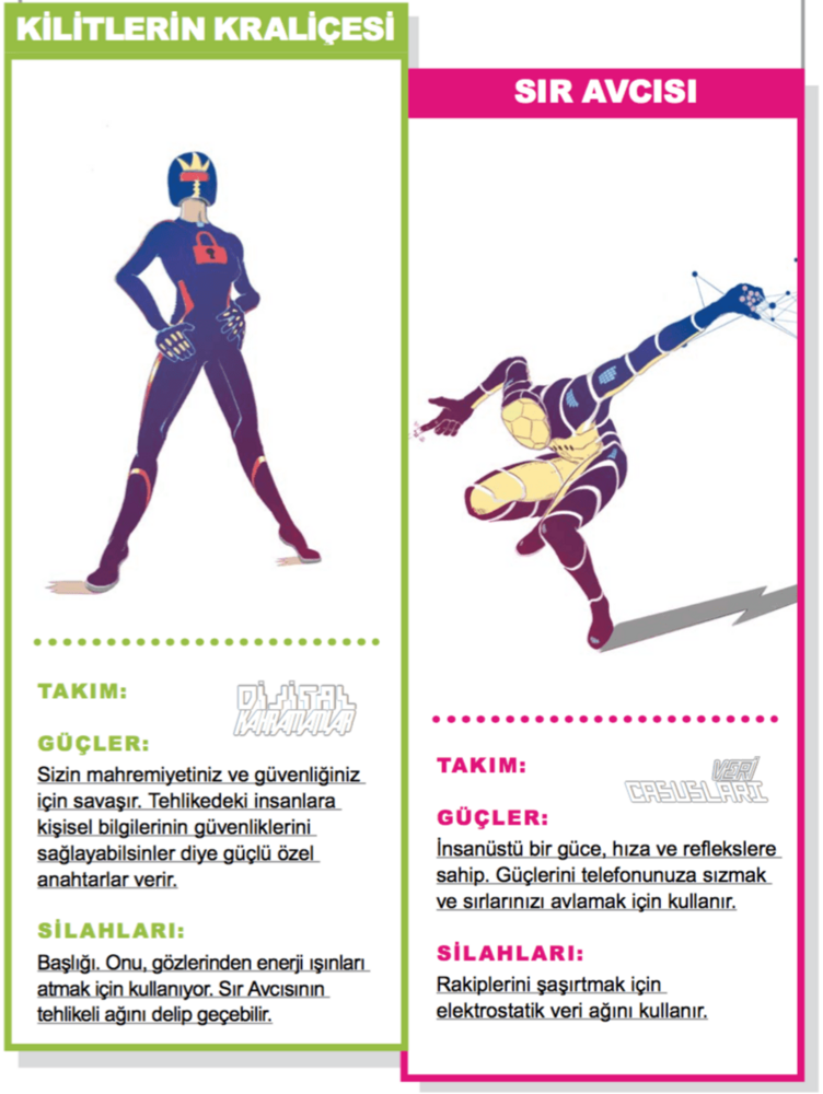 Kitapçık, çocukların dijital paylaşımlar konusunda daha güvenli ve daha bilinçli seçimler yapmalarına yardımcı olmayı amaçlıyor. Kitapçık; çocukları yakalayacak görseller ve anlayabilecekleri bir dille karmaşık güvenlik konularını anlatırken internette karşılarına çıkabilecek “tehlikeli” kişilikleri çizgi roman/oyun karakterleri şeklinde tanıtarak çocukları uyarıyor. Kitapçığın konuları anlatan içeriklerinin yanındaki kutucuklarda kurulan paralel evrende “Dijital Koruyucular” isimli süper kahraman takımı şeytani veri casuslarına karşı savaşıyor. Böylece kitapçık; mahremiyet nedir, akıllı telefonlarda güvenlik nasıl artırılır, güvenli mesajlaşma sistemleri nasıl kullanılır, şifre nasıl seçilir, internette gezerken bizi neler bekler gibi konuları çocuklara onların ilgisini çekecek bir şekilde anlatıyor ve çocukların neyin ne olduğunu bilerek internette var olmalarını hedefliyor.