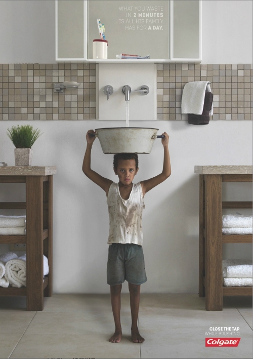 30 saniyelik filmin sonunda, küçük kızın başının üstüne kaldırdığı leğen, genç kadının lavaboya boşa akıttığı suyla dolmaya başlıyor. Colgate’in bu sırada verdiği mesaj 1. Dünya ülkelerinin duyarsızlığını yüzümüze vuruyor: “iki dakikadır boşa akıttığın suyla o, iki gün yaşıyor.”