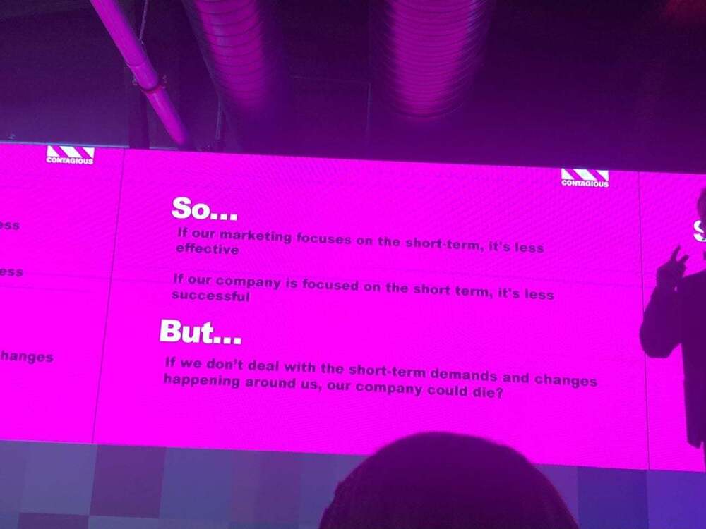 Contagious; marka, ajans, teknoloji şirketleri ve akademi cephelerinden önde gelen isimlere “2015’te işletmelerin karşılaştığı en önemli sorun hangisidir?” sorusu yöneltilmiş. Karşılığında ise Yapay zeka, büyük veri, blockchain, marka vaadi ve içerik yanıtları alınmış. Markalar da yöneticiler de yaratıcılar da ekonomistler de aynı şeyi söylüyorlar bu yanılar ve çatılarıyla alakalı. Uzun vadeli adaptasyon için çeviklik gerekiyor. Sürekli değişimde olan sektörler olduğu için artık değişim hızı da ona uygun ve aynı çeviklikte gitmeli. Kısa vadeli planlardan ziyade uzun vadeli yapılar kurgulayan şirketler ortalama gelirlerini %47 artırmış. Pazar olarak da uzun vadeli yatırımlarla büyüme hızı dengeli ve hızlı şekilde ilerliyor. Pazar içerisinde uzun vadeli adım atınların, kısa vadeli plan yapanlara göre 6 kat hızla ilerlediği görülmüş.