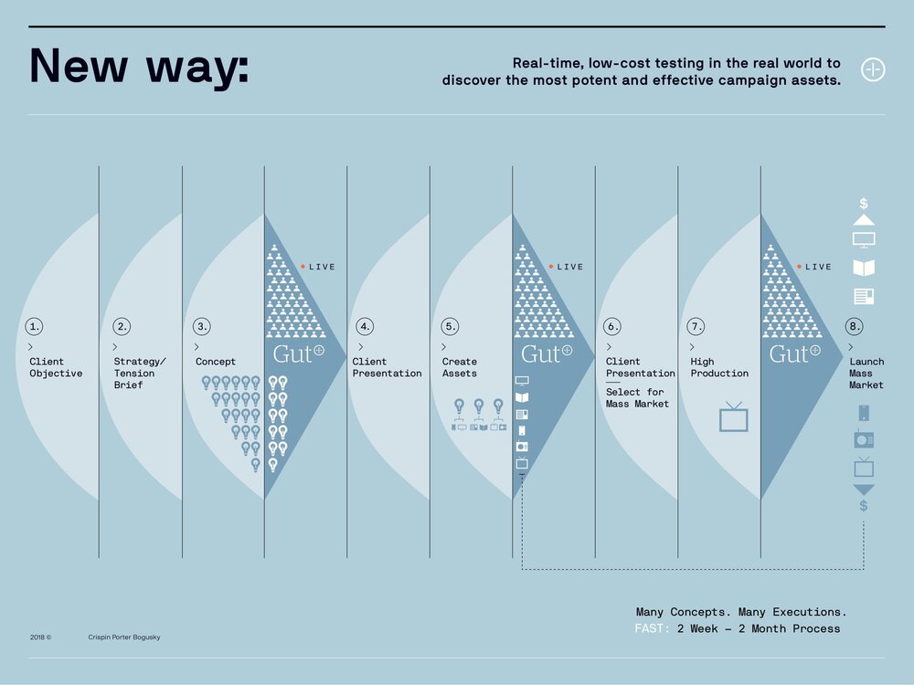 Bir MDC Partners ajansı olan, eski adıyla CP+B, yeni adıyla Crispin Porter Bogusky + (CPB+), yalnızca adını değiştirmekle kalmadı aynı zamanda Co-Lead Design Adam Skalecki’nin de belirttiği üzere, ”ajansın her zaman sahip olduğu başkaldıran doğasını” ve ”punk ruhunu” koruyarak yeni bir marka yarattı. Co-Lead Design David Balsemello, yeni logoda stensil şeklinde bir font kullanılarak biraz endüstriyel biraz da maker-y bir hava katmayı amaçladıklarını belirtti. Yeni logonun yanı sıra, CPB+’ın internet sitesi de yenilendi ve modern bir teknoloji şirketi görünümü kazandırıldı. Adam Skalecki, bu görünümle ajansın sağladığı servisler ve sattığı ürünlerle tanınmasının amaçlandığını belirtti. CPBT+’ın internet sitesinde Gut+ ve Crisp Jam adındaki yeni yaratıcı süreçler eğlenceli bir dille tanıtıldı. Ayrıca, Bogusky’nin Linkedin de yayınladığı yazısında da belirttiği üzere, Truth kampanyasıyla gündeme gelen “Human Lie Detector” yazılı tişörtler, ajansın internet sitesinde satılarak elde edilen gelirle medya okur yazarlığını arttırmak için çalışan programlar desteklenecek.