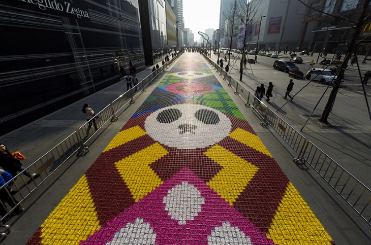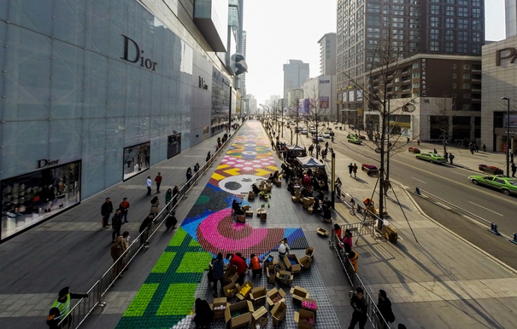 19 Şubat’ta Çin takvimine göre yeni yıla girecek olan Çin halkı için önemli değerler halı üzerinde yer alıyor. Panda, yeni açan çiçekler bu kültür içerisinde hep iyi dilekleri ve iyi şansı hatırlatıyor. Bu devasa halı 185 metre uzunluğunda ve 7 metre genişliğinde. Bir sokağı baştan sona dolduran bu yerleştirme 2.000 gönüllüyle toplam 5 günde yapılmış.