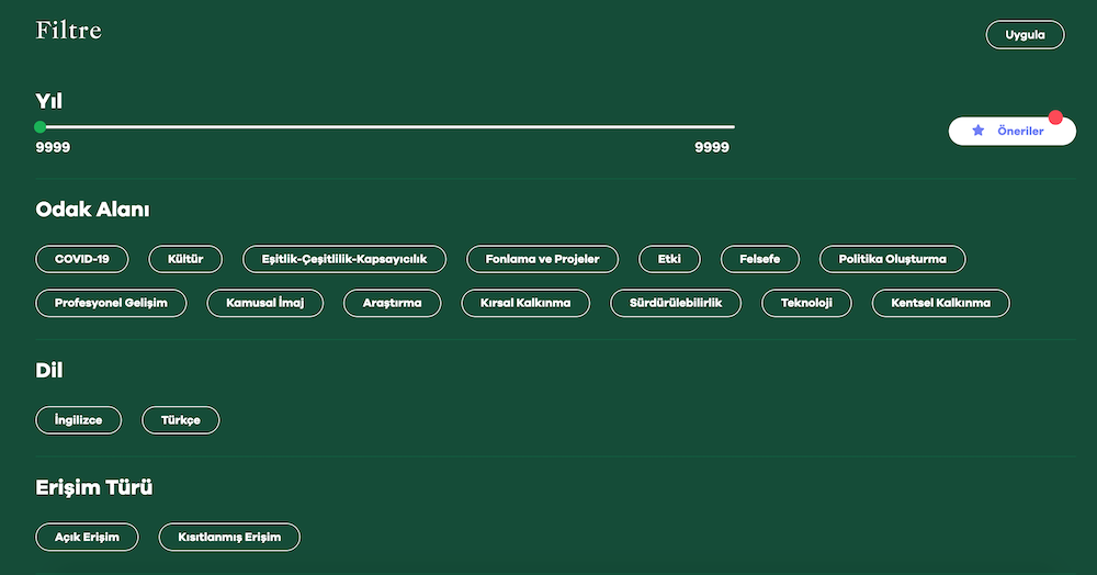 Kütüphaneye buradan erişebilirsiniz. Dil tercihinizi Türkçe yaparak ya da buraya tıklayarak kütüphanede Türkçe başlıklarla gezinebilirsiniz. Ayrıca aşağıdaki filtreleme seçenekleriyle aradıklarınıza daha rahat ulaşabilirsiniz.