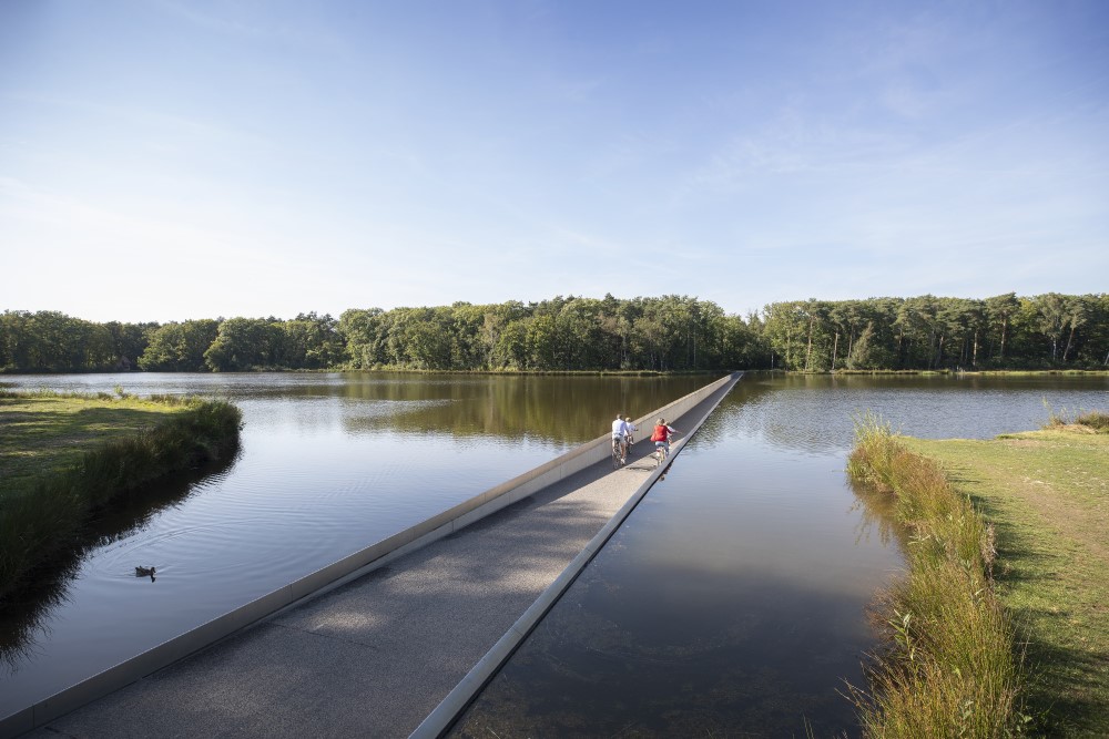 Belçika’nın Limburg eyaletinde yer alan Cycling through Water 2016 yılında açılmış. Bisiklet yolu ağının bir devamı olan bu köprüden geçerken suyun içine gömülü bir zeminde pedal çeviriyorsunuz. Kafanızı çevirdiğinizde ördeklerle aynı göz hizasında olduğunuzu görüyorsunuz. Bu 212 metrelik eşsiz parkur, Limburg’un turist bilgi merkezi Visit Limburg’un girişimiyle De Wijers doğa parkında, Belçika’nın en büyük açık hava müzesi olan Bokrijk’in bir parçası olarak inşa edilmiş. Dolayısıyla yalnızca suyun değil yeşilin de keyfini çıkarabiliyor bisikletçiler. Bölgenin çekiciliğini korumayı amaçlayan bu yenilikçi proje, mimarlık firması Lens°Ass Architecten’in imzasını taşıyor.