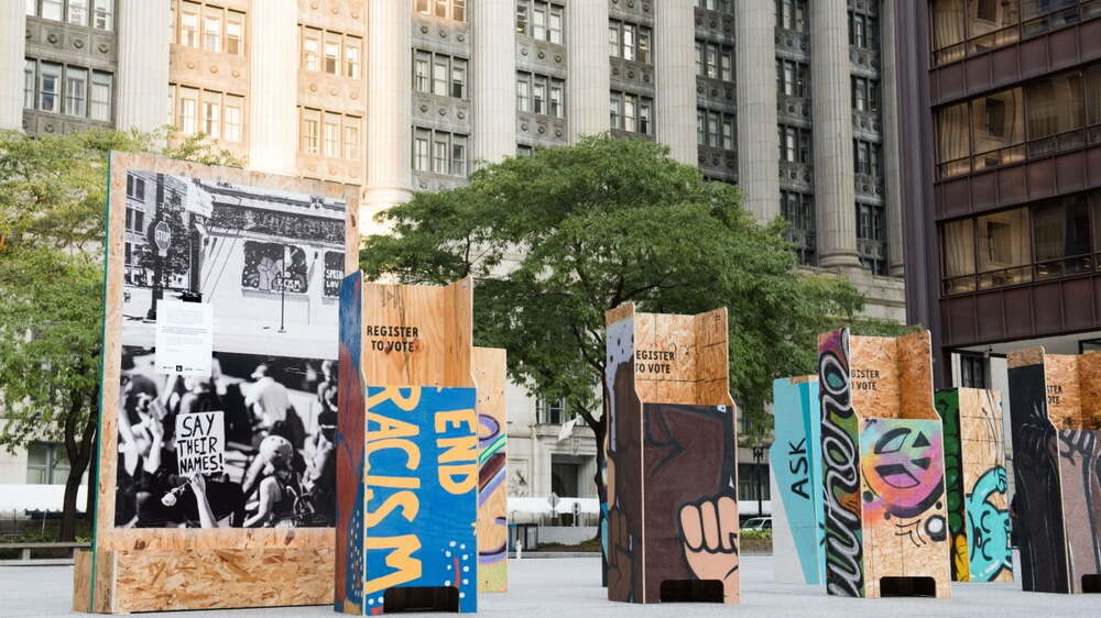 Very proud to help launch the #BoardsOfChange project with the City of @chicago, @chicagosmayor and @fcbchi! @whenweallvote transformed plywood graffiti from storefront windows into voter registration booths to encourage local #civicengagement. https://t.co/17fJDpXEQG #VOTE pic.twitter.com/0DwC9SvOnT