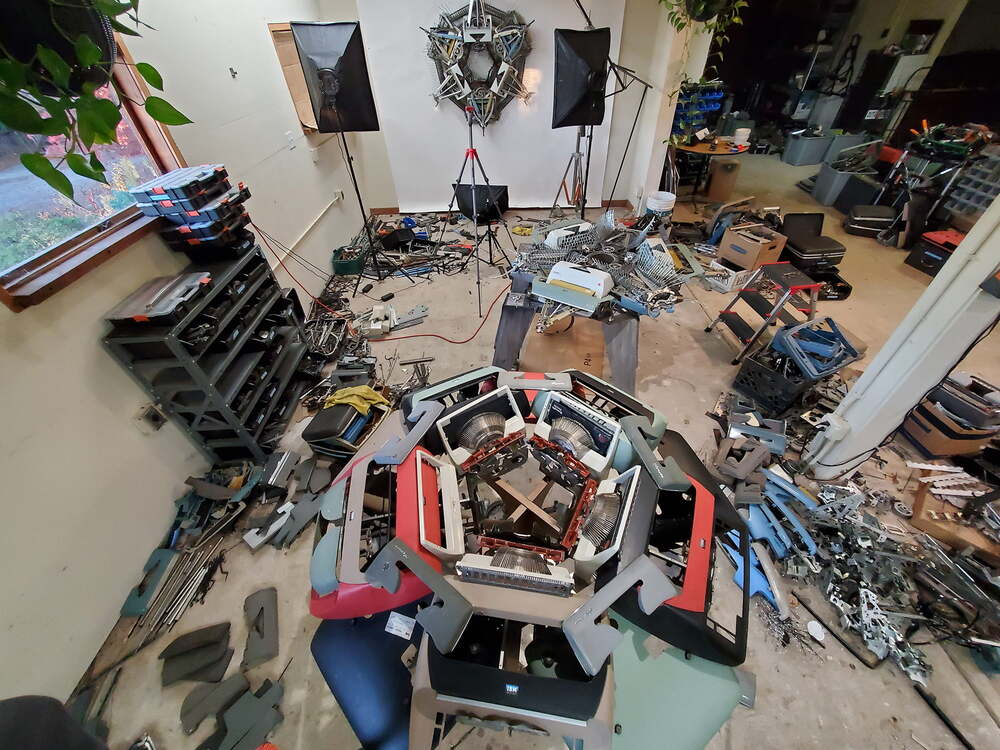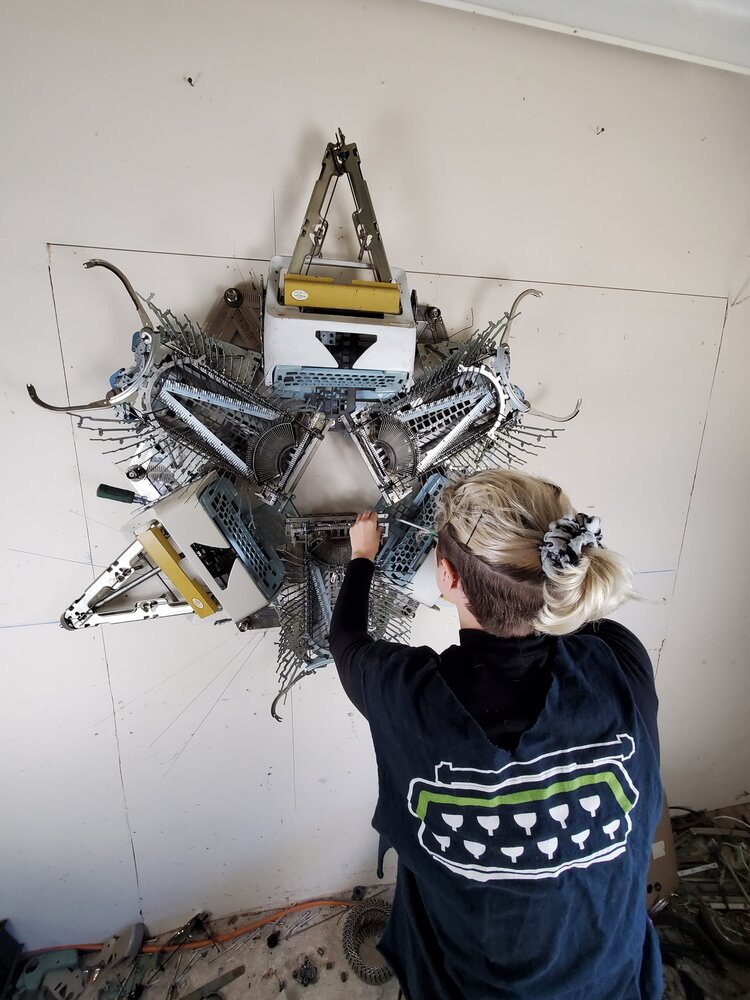 Mayer’in metal sanat eserlerinin boyutları 65 inç’e (1,651 m) kadar çıkabiliyor. Lazerle kesilmiş bir alüminyum çerçeve etrafına monte edilmiş eski daktilo parçalarından oluşuyorlar. Merkezdeki dairesel bir unsur etrafında kümelenen çok üniteli simetrik yapılar bunlar. Mayer bu heykelleri yapabilmek için San Francisco Körfez Bölgesi çevresindeki tamirhanelerden, ikinci el mağazalarından ve bahçe satışlarından sık sık daktilo satın alıyor. Daktilo ne kadar hasarlıysa o kadar işe yarıyor. Geçmişte de figüratif heykeller yapmak için eski metal makinelerin küçük parçalarını topluyormuş.