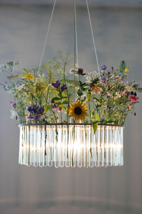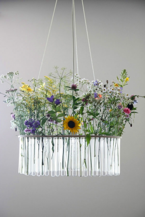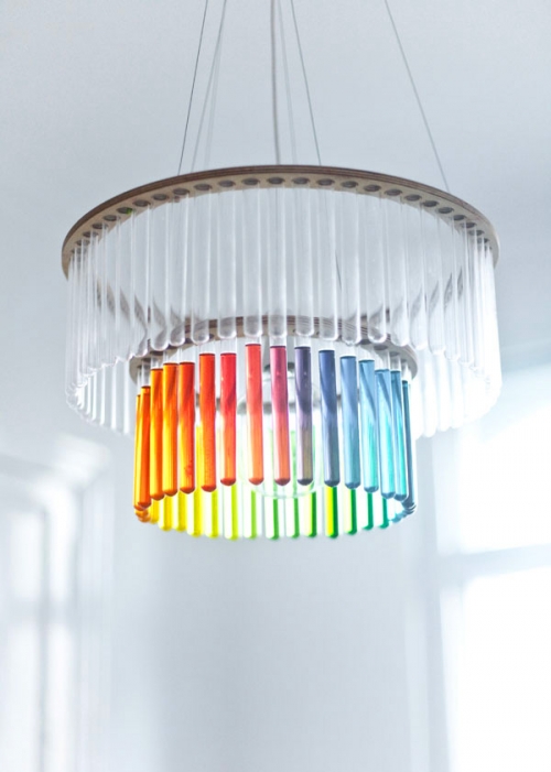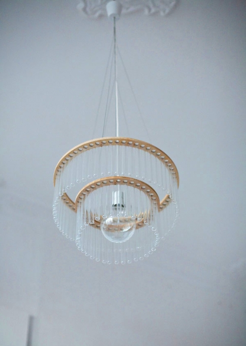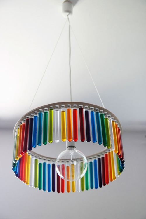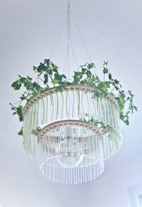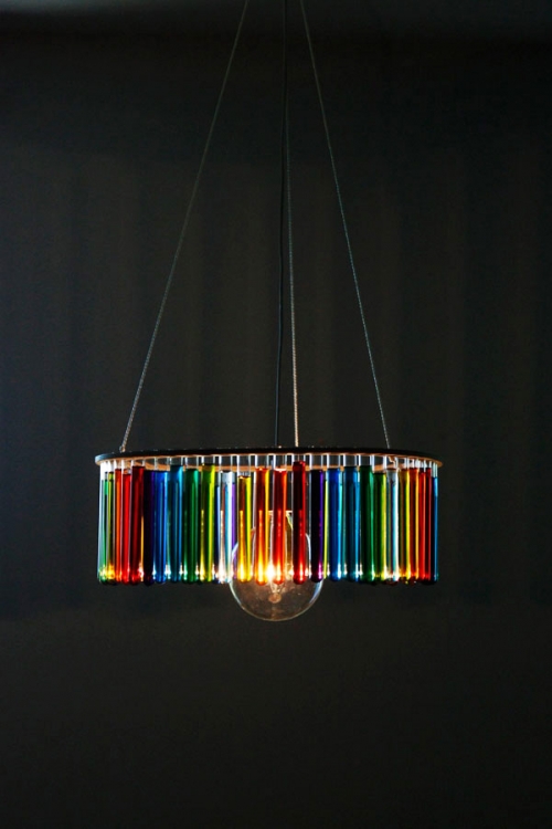 Maria SC avize, iki kontrplak çember ve kimya deney tüplerinin kombinasyonundan meydana geliyor.