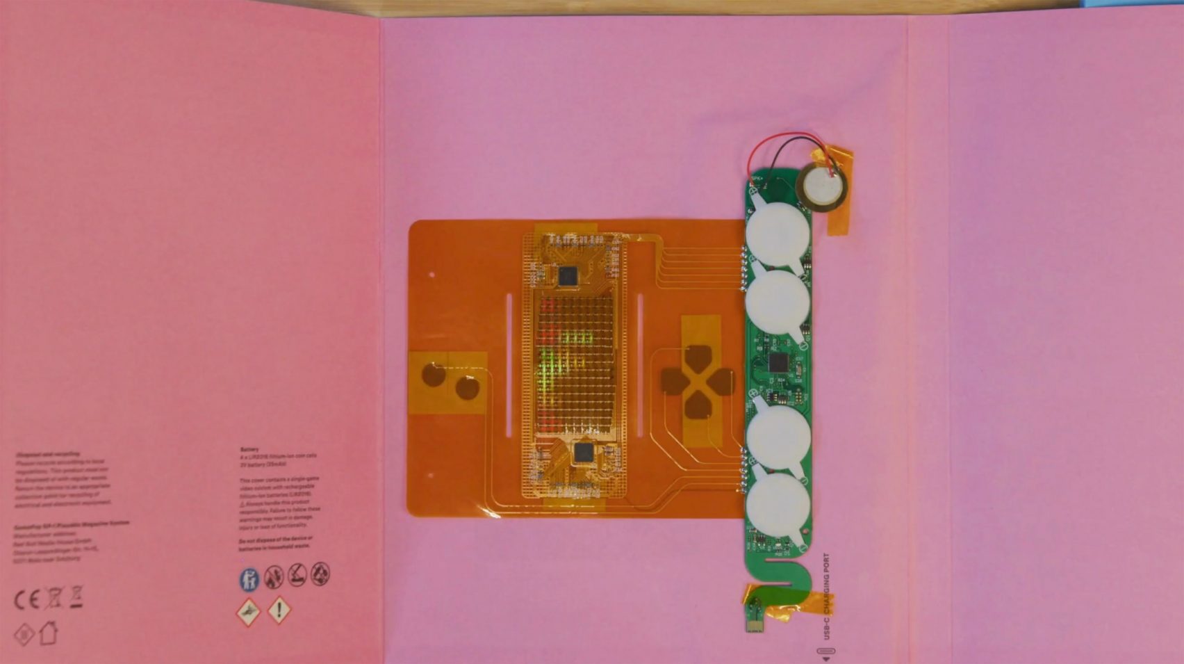 İnce yapısıyla dikkat çeken kapakta, yalnızca iki milimetre boyutunda 180 adet RGB LED’den oluşan özel bir matris yer alıyor. Bu LED’ler, kalınlığı sadece onda bir milimetre olan esnek bir devre kartına lehimlenmiş durumda. Kağıt katmanları arasına yerleştirilen bu devre, en kalın noktasında yaklaşık beş milimetreye ulaşan, bükülebilir bir kapak oluşturuyor. Şarj edilebilir düğme piller de bu kalın bölgede konumlandırılıyor.