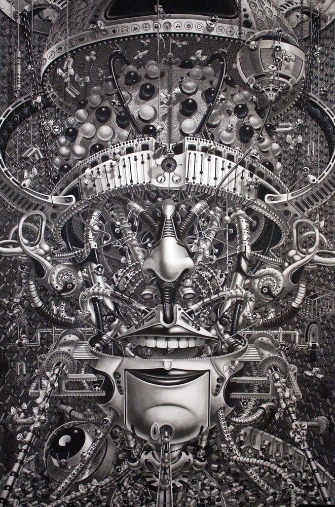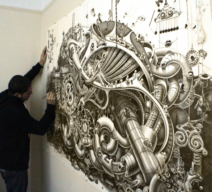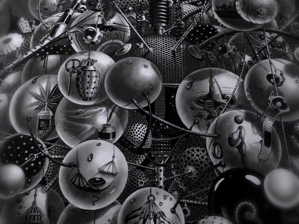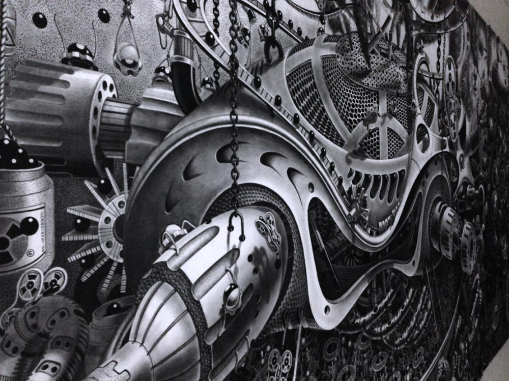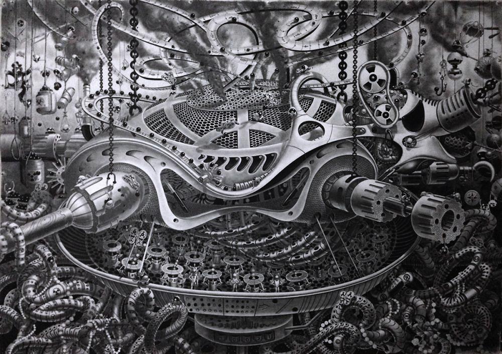 New Yorklu sanatçı Samuel Gomez’in grafit ve siyah mürekkep kullanarak ortaya çıkardığı siyah beyaz çizimlerinde Steampunk tarzında sürreal bir gerçeklik resmediliyor. Oldukça büyük yüzeyler üzerinde çalışan sanatçı ince uçlu kalemiyle önce kompozisyonu ana hatlarıyla çiziyor ve sonra detayalandırıyor.