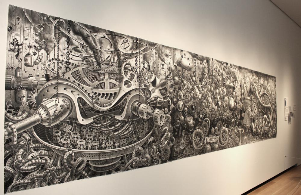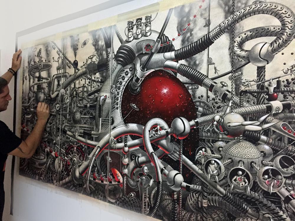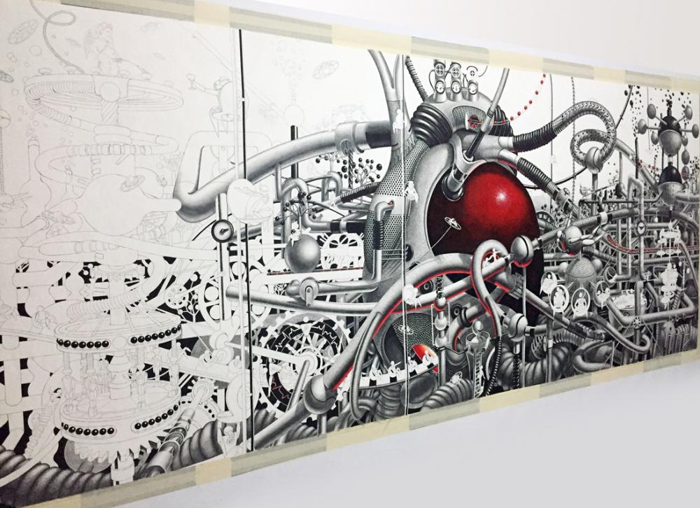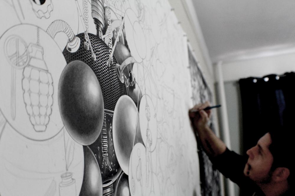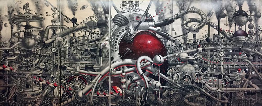 New Yorklu sanatçı Samuel Gomez’in grafit ve siyah mürekkep kullanarak ortaya çıkardığı siyah beyaz çizimlerinde Steampunk tarzında sürreal bir gerçeklik resmediliyor. Oldukça büyük yüzeyler üzerinde çalışan sanatçı ince uçlu kalemiyle önce kompozisyonu ana hatlarıyla çiziyor ve sonra detayalandırıyor.