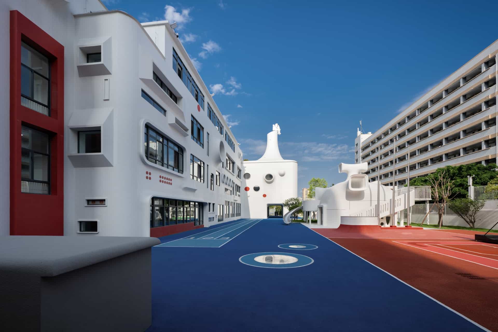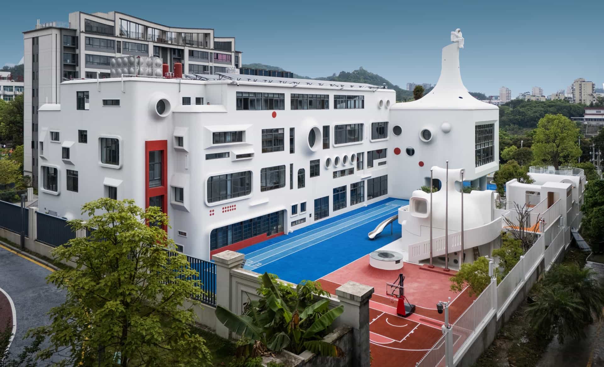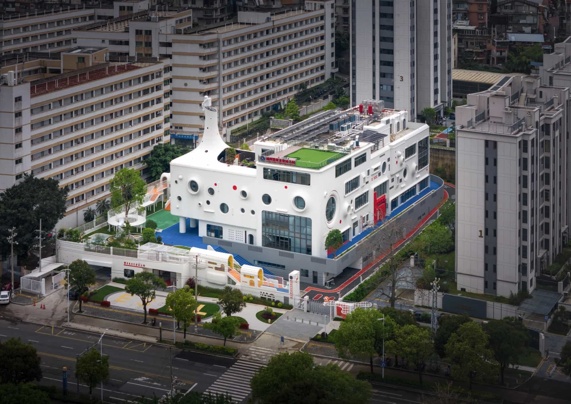 Çin’in Fujian vilayetinin başkenti olan Fuzhou şehrinde kapılarını açan Fuzhou ESUO Future Kindergarten (Fuzhou ESUO Gelecek Anaokulu) erken çocukluk eğitiminde çocukların hayallerini tetikleyecek ve gözlerini ışıl ışıl edecek bir mimari sunuyor. Guangzhou merkezli mimarlık ofisi Dika Architectural Design Center tarafından hayata geçirilen proje gayrinizami bir cephesi, oyuncaz mizacı ve tepesindeki astronot yerleştirmesiyle adeta çocuk olup okula en baştan başlama isteği uyandırıyor.