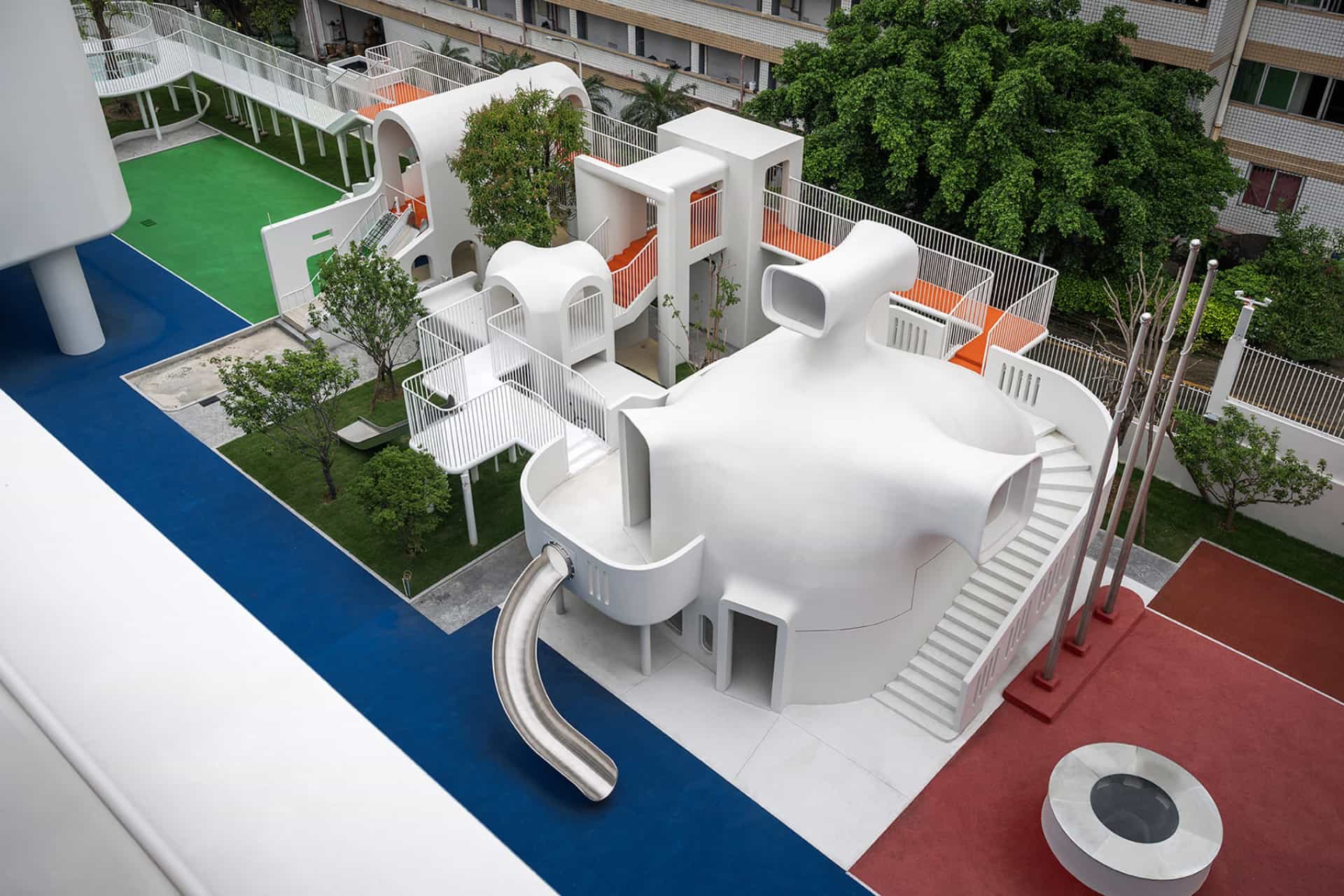 En geleneksel kalıplarla bile baktığımızda anaokulu her zaman oyun alanı, renkli mizacı ve çocukları önceliklendiren planlamasıyla daha dinamik ve cazip bir mizaca sahiptir. Fuzhou ESUO Future Kindergarten tüm bunların üzerine binayı geleneksel planından çıkararak çocuklar için zeminden koridorlara ve çatıya kadar uzanan üç boyutlu bir keşif yolculuğuna dönüştürüyor.
