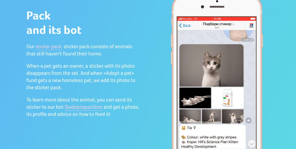 “Adopt a Pack” setini indirip kullanmaya başlayınca yollanan çıkartma üzerinden sahiplenebileceğiniz hayvanların bilgilerine de erişebiliyorsunuz. Possible Moscow’un yaratıcı yönetmeni insanların konuşmalarına girmenin bu projenin yayılması için çok önemli olduğunu ve Telegram’ın Rusya’daki gençler arası kullanım yaygınlığının bunu çok iyi karşıladığını düşünüyor. Çünkü artık konuşmalarımız kelimelerden çok görsellere dönmeye başladı. Eğer çıkartmaları bot’a yollarsanız size hemen hayvanın geçmişini ve nereden sahiplenebileceğinizi listeliyor ve voila, ömürlük yoldaşınıza merhaba deyin!
