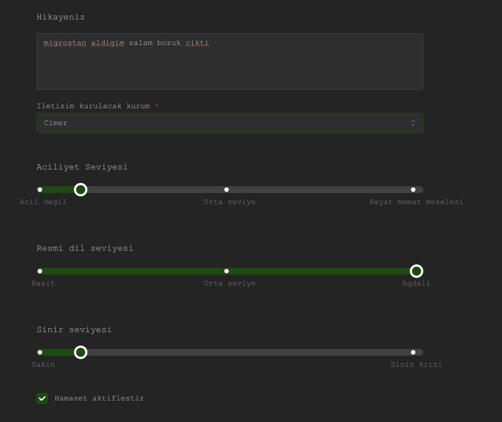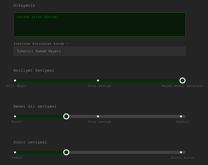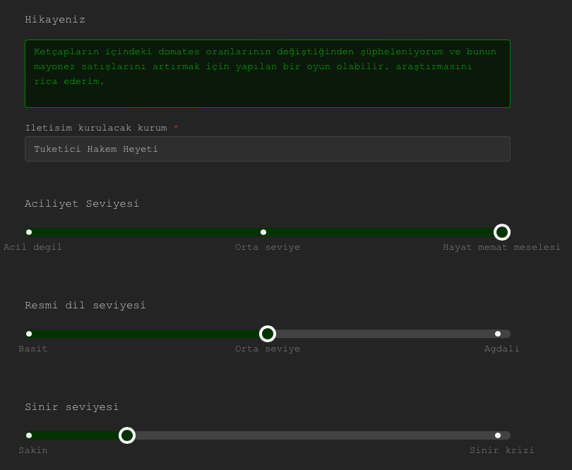 Hikayenizi belirttikten sonra Dilekçe Robotu üzerinden iletişim kurulacak kurumu, resmiyet, aciliyet, öfke gibi metrikleri bir bar üzerinden derecelendirip hamaset, alaycılık, pasif-agresif ton, konuyu toplumun tamamına yaymak, popülist uslüp gibi farklı safsataları da dilekçenize dahil edebiliyorsunuz.