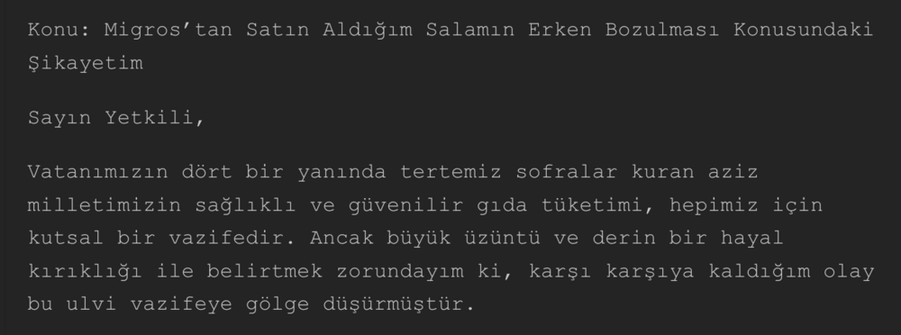 Bu nedenle, yaşadığım bu olayın incelenerek, derhal gerekli önlemlerin alınmasını talep ediyorum. İlgili makamlardan bu durumun düzeltilmesi adına acil adımlar atılmasını bekliyor, vatanımın her köşesinde kaliteli ve düzenli hizmet almanın hakkım olduğunu hatırlatıyorum.