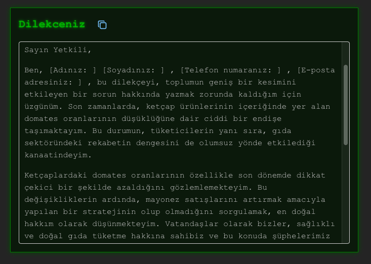 Yazılım mühendisi Batuhan Katırcı’nın geliştirdiği yapay zeka arayüzü Dilekçe Robotu, sizi sıkan konuları ilgili kurumlara iletebileceğiniz kapsamlı dilekçelere dönüştürüyor. Bunu yaparken Türkiye medyasından aşina olunan söylemleri ve vurguları dilekçelerin içine serpiştirerek metni de uzatıyor.