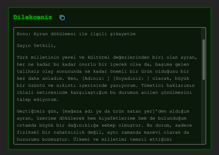 Farklı sorgular ve hikayeler üzerinden yapay zeka arayüzünün verdiği dilekçe örnekleri herhangi bir konunun bağlamının nasıl değişebileceğini gösterirken trajikomik mesajlar hazırlamamıza da imkan tanıyor. Batuhan Katırcı’nın da belirttiği gibi sayfa herhangi bir an kapanabilir veya bozulabilir. Biraz eğlence biraz da gülümseme amaçlı kullanılabilecek deneysel bir proje.