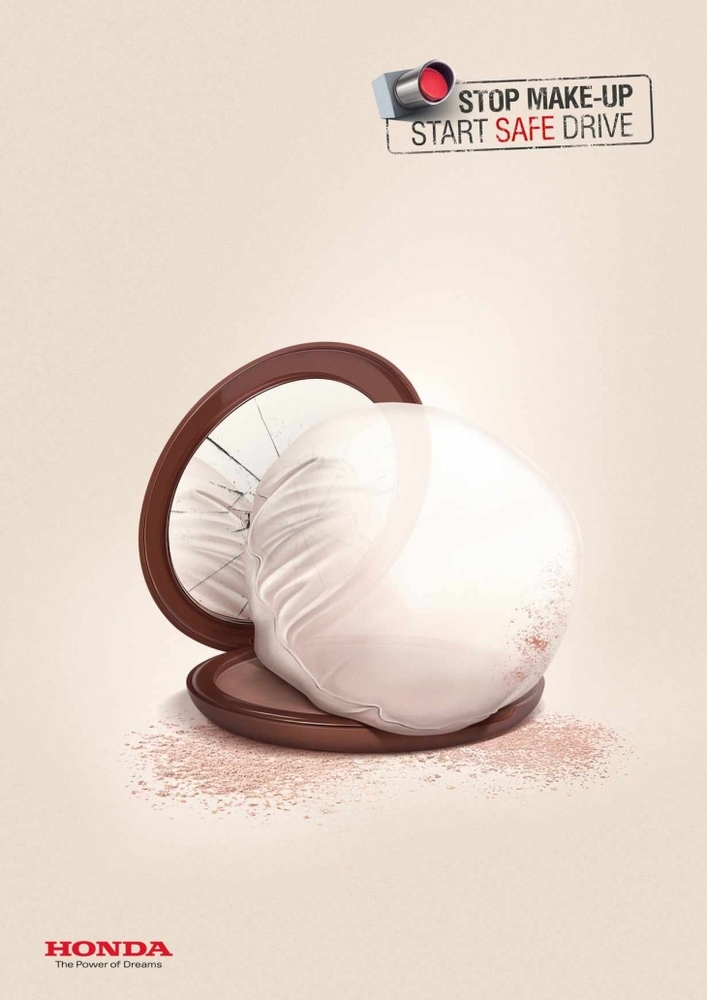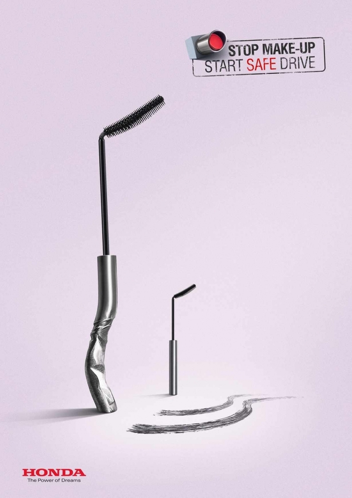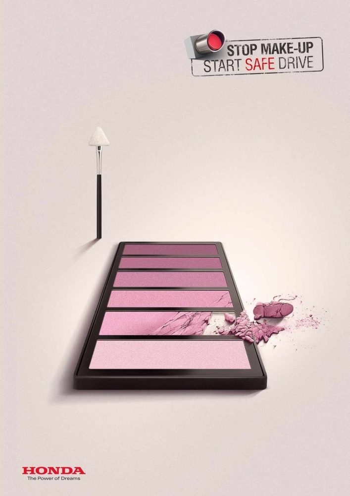 Honda da sürücüler araç kullanırken makyaj yapmasınlar diye başrolünde makyaj araç gereçlerinin yer aldığı bir yaratıcı ilan serisi yayınladı. İlanların mesajı çok net: “Makyaj yapma, güvenli sürüş yaşa”. Bu arada 2012’de Volkswagen’in YouTube’daki etkileyici gerilla çalışmasını da bu vesile ile hatırlayalım.
