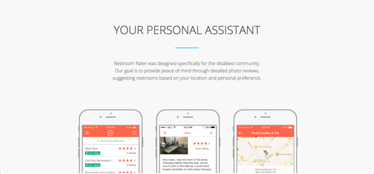Restroom Rater uygulaması engelli bireyler başta olmak üzere bu sorunu yaşayan herkesin en yakın temiz tuvaleti bulmasını sağlıyor. Uygulamanın veri havuzu, kullanıcıların fotoğraf ve yorumlarıyla büyüyüp şekilleniyor. Kişisel tercihlere ve konum tabanlı rehberlik servisi ihtiyaç anında yardıma koşuyor.