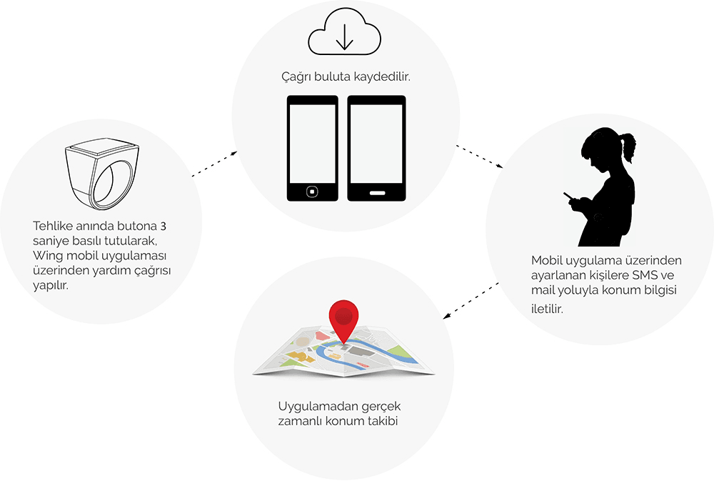 Wing tıpkı Loop gibi mobil uygulama ile çalışıyor. Kullanıcının, tehlike anında yardım isteyebileceği kişilerin telefon numaralarını önceden mobil uygulamaya girmiş olması gerekiyor. Kullanıcılar Bluetooth aracılığıyla Wing ile mobil telefonlarını eşleştirebiliyor ve acil durumda yardım çağrılabilecek kişiler listesini bu yolla oluşturabiliyor. Tehlike anında Wing’in düğmesine basıldığında cihaz bu kişilere yarım isteyen kişinin konumuyla birlikte SMS ve/veya bildirim gönderiyor. Yüzüğün altında bulunan butonu 3 saniye boyunca basılı tutmak gerekiyor. Bunun ardından yardım çağrısı yapan Wing, kullanıcıya bir titreşim ile yardım çağrısını ilettiğini de bildiriyor. Bu gerçekten iyi düşünülmüş bir ayrıntı. Çünkü o panik anında kullanıcının bunu bilmeye de ihtiyacı var.
