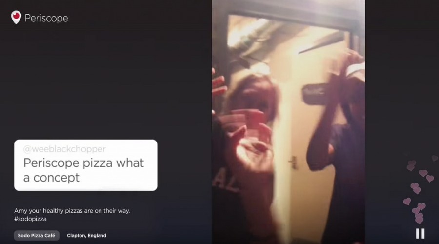 TBWALondra ve yerel bir spor kulübü, Sodo müşterilerine pizzalarını teslim etmek için düşük maliyetli pazarlama hamlesi gerçekleştirmek üzere bir araya geldi. Canlı Periscope yayınları, koşucular teslimat adresine ulaştırana kadar kullanıcıların siparişlerini gerçek zamanlı olarak takip edebilmesini sağladı. Aynı zamanda, kullanıcılar koşucu teslimat ekibine kestirme yollar hakkında mesaj gönderebildi.