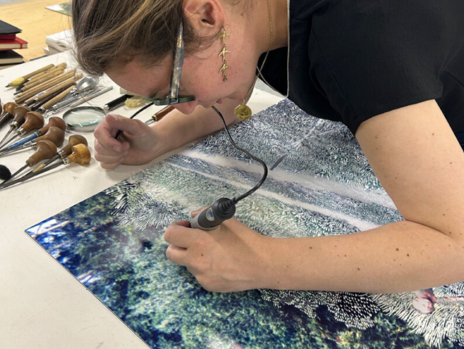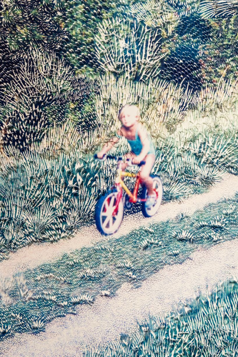 Raphaëlle Peria, bu yeni serisinde, babasının arşivinden seçtiği eski fotoğraflar üzerinde çalışarak Canal du Midi çevresindeki çınar ağaçlarının yıllar içinde mantar hastalığı nedeniyle nasıl yok oluşa sürüklendiğini anlatıyor. Sanatçı, “Bu ağaçlar 200 yıldır yaşıyordu ama şimdi bir mantar yüzünden teker teker kesiliyorlar. 72.000 ağacın 42.000’i zaten yok oldu,” diyerek, çevresel felaketin ciddiyetini vurguluyor. Fotoğrafların üzerine yaptığı ince oyma işlemleriyle, doğanın zamanla nasıl aşındığını görsel olarak ifade eden sanatçı, pleksiglas malzeme kullanarak fotoğraf, çizim ve heykel arasında geçiş yapan çok katmanlı eserler yaratıyor.